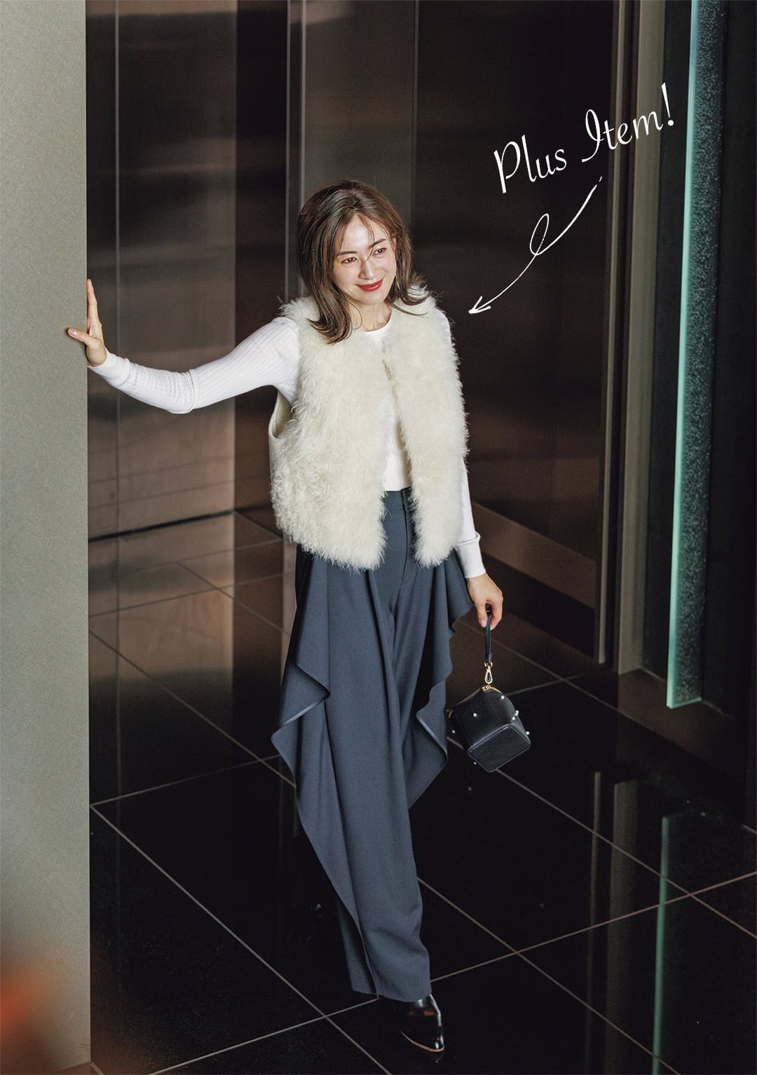 ペプラムツイードベスト¥27,500(Acka.) シャツ¥8,900(W:Huku/K&G INTERNATIONAL) イヤーカフ[右、上]¥2,420〈アプロ〉イヤーカフ[右、下]¥3,300〈Boite de maco〉リング[左]¥37,400〈Pearl for Life〉(すべてロードス) イヤーカフ[左]¥15,400(アガット)