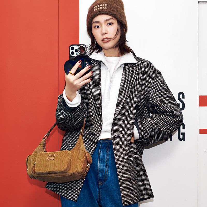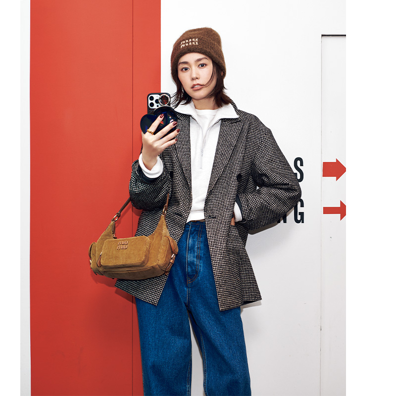 ジャコット¥49,940(23区/オンワード樫山 お客様相談室)ハーフジップスウェット¥27,500(サードマガジン)ロンT¥14,300〈RHC〉デニムパンツ※別注¥27,500〈ウエストオーバーオールズ〉(ともにRHC ロンハーマン)リング¥35,200(プラウ)ニット帽¥67,100バッグ¥462,000※ともに予定価格(ともにミュウミュウ/ミュウミュウ クライアントサービス)ベルト¥11,000(レフィエ/フラッパーズ)アイフォンケース¥10,450〜(エジュー)