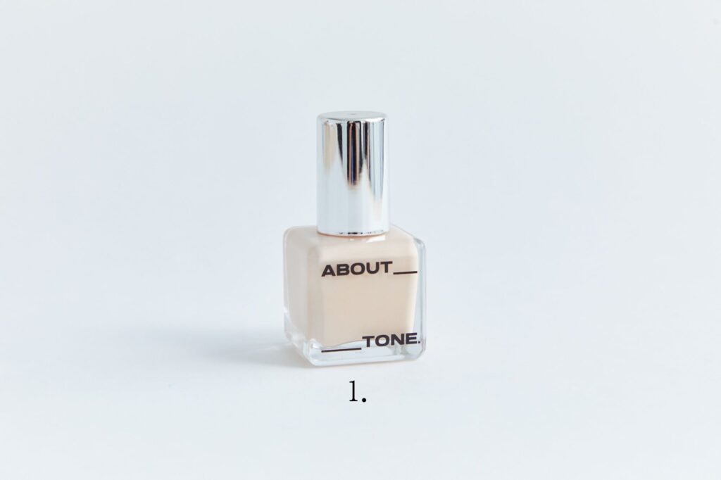 1.リキッドファンデーション「ABOUT TONE スキンレイヤー フィットファンデーション 19」を顔全体に薄くなじませます。少しマットな質感なので、スキンケアで肌をしっかり保湿してから塗るのがおすすめです。最近使い始めたのですが、早くも最愛ファンデになっていますね。仕上げにパウダーを使わなくても、質感がきれいに整うところがお気に入り。明るめのトーンで透明感のある肌に見せられるし、長時間つけていてもきれい!