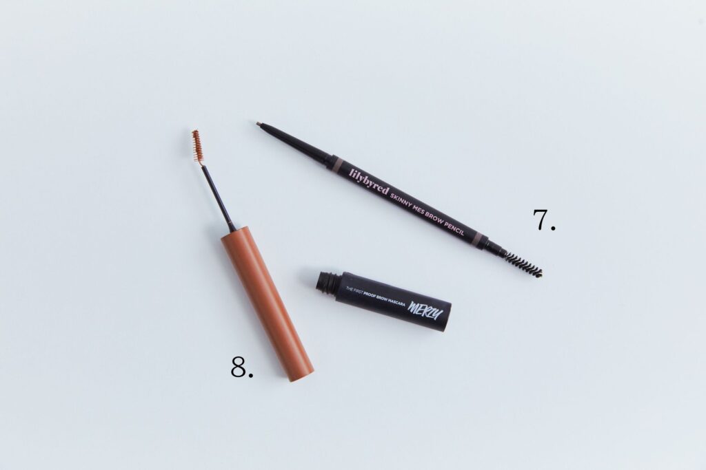 7~8.眉ペンシル「Lilybyred スキニー メス ブロウ ペンシル #04」で毛のない部分に毛流れを繊細に描き足して、眉マスカラ「MERZY ザ ファースト プルーフ アイブロウ マスカラ BM2」で眉色を明るく整えます。細めの芯の眉ペンシルで繊細な毛流れが描きやすい! 眉マスカラは、細めのブラシで繊細に塗りやすいところが気に入っています。