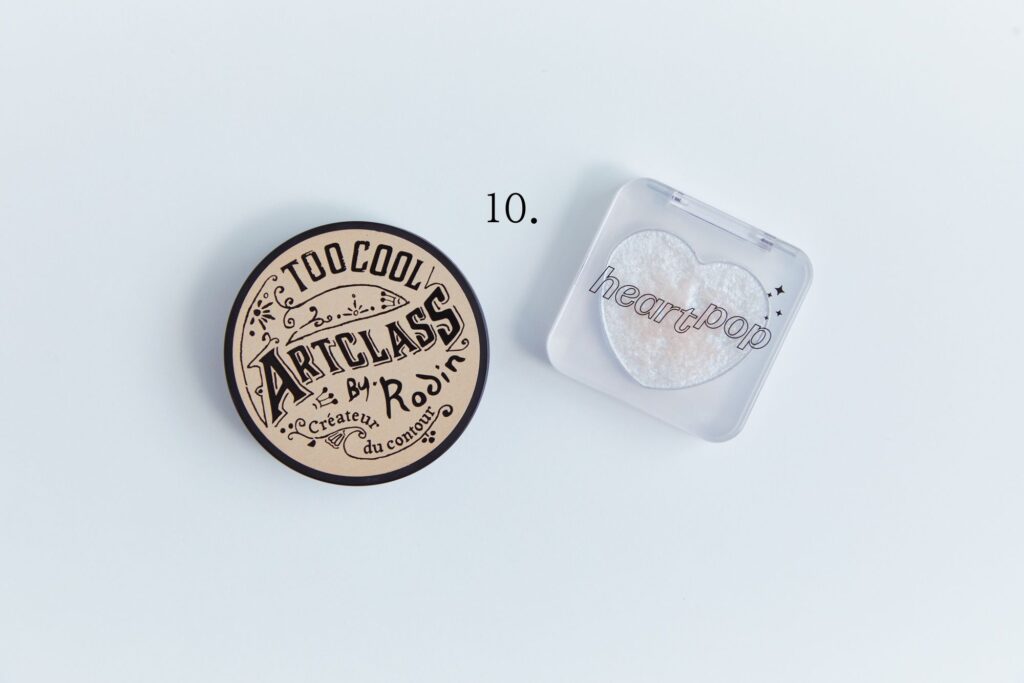 10.ハイライター「エチュードハウス ハートポップブラッシャー White Dolphin」を鼻根と鼻先に指でチョンと点置きして、立体感とツヤを演出。普段はあまりハイライターを使わないのですが、華やかに見せたい日に楽しんでいます。