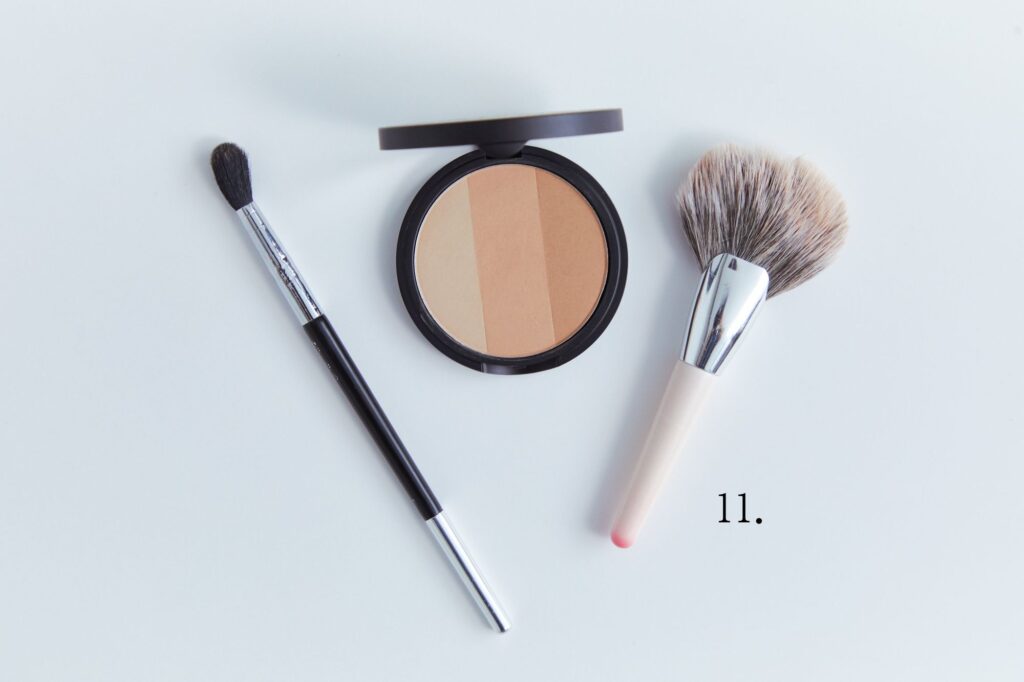 11.シェーディング「too cool for school ARTCLASS by Rodin シェーディング モダン」の濃い2色を大きめブラシでブレンドして、フェイスラインを削るようにぼかします。赤みの少ない“モダン”というカラーがブルベ肌と好相性。明るいカラーを眉頭の彫りに細めブラシでサッとぼかして、ノーズシャドウを入れることも。