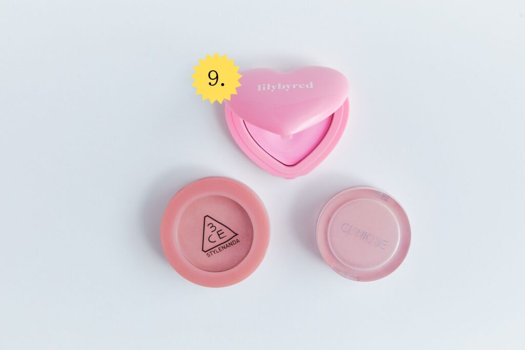 9.ピンクのクリームチーク「Lilybyred ラブビームチークバーム 02」を目の真下から▽に広範囲にぼかします。韓国では、肌が艶やかに見えるクリームチークが大人気。肌なじみがいいのに、ブルベに映える白みピンクがしっかり発色するので、チーク主役のオシャレもキマります!