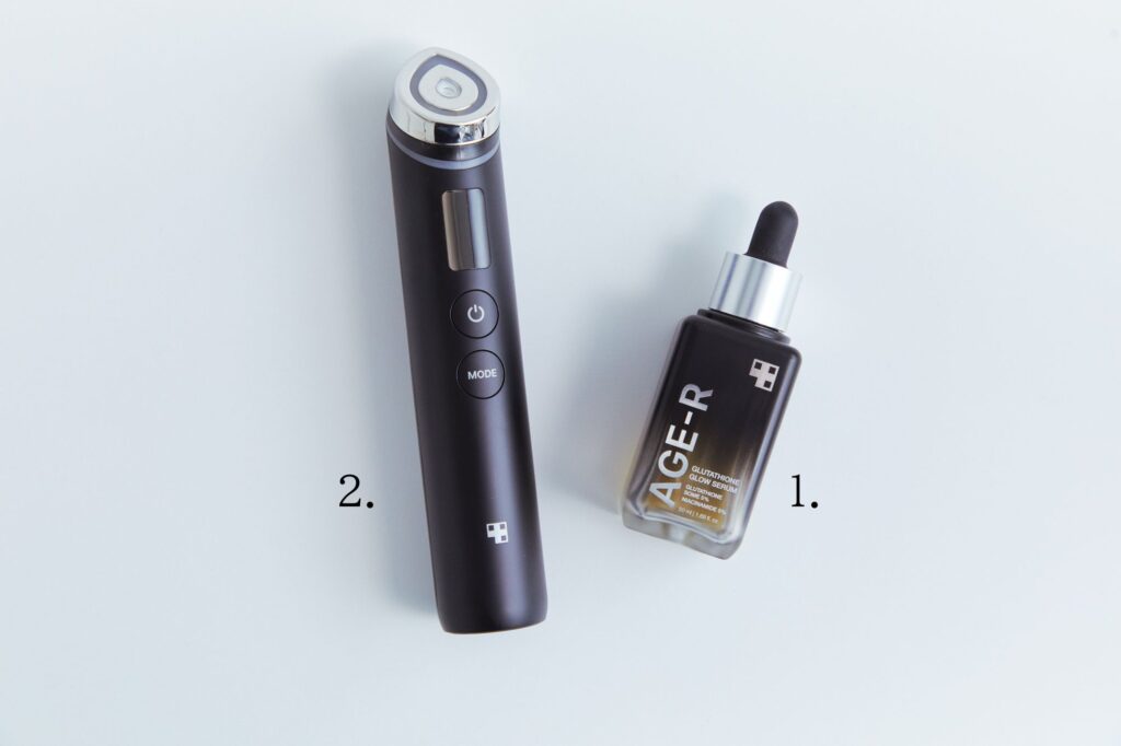 撮影の前夜など、丁寧にケアしたいときに重宝しているのは、「MEDICUBE AGE-R GLUTATHIONE GLOW SERUM」と「MEDICUBE グルタチオングロウアンプル」。このグルタチオン美容液を、導入ケアもできる多機能美顔器でじっくり浸透させると、肌がなめらかに整って透明感が爆上がりするんです!
