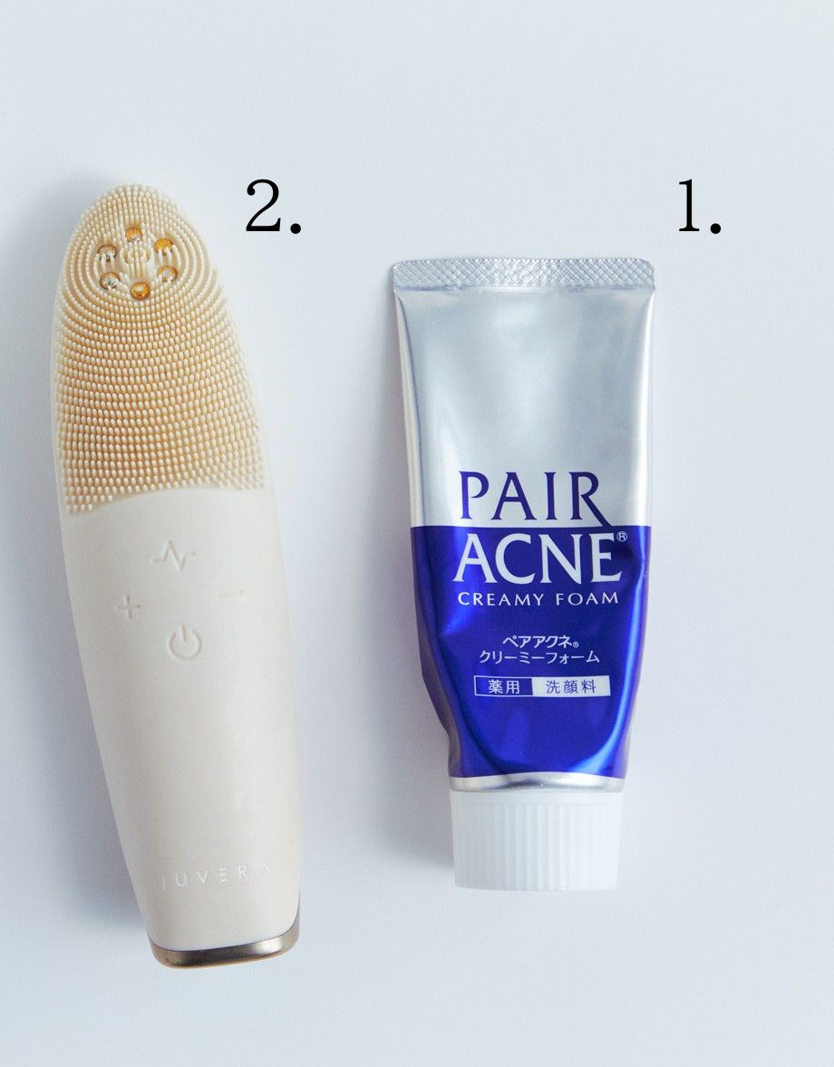 夜の洗顔で重宝しているのは、「ペアアクネクリーミーフォーム」。日本の「ペアアクネ」は、韓国でもニキビクリームが有名なんですよ! 元々はニキビクリームを愛用していたのですが、来日したときに同じシリーズの洗顔料を発見。使い続けたらニキビができにくくなりました! 夜は、「JUVERA 振動クレンザー プレミアムプラス」という洗顔ブラシ付きの美顔器を使うこともあります。仕事柄、しっかりメークで長時間いることが多いので、美顔器を使って毛穴に詰まった汚れやメークをオフ。このひと手間でニキビや肌荒れができにくくなります。