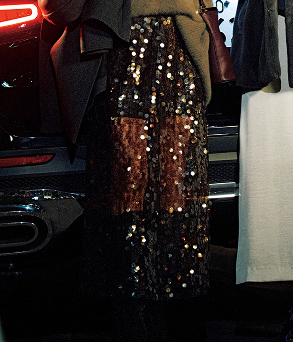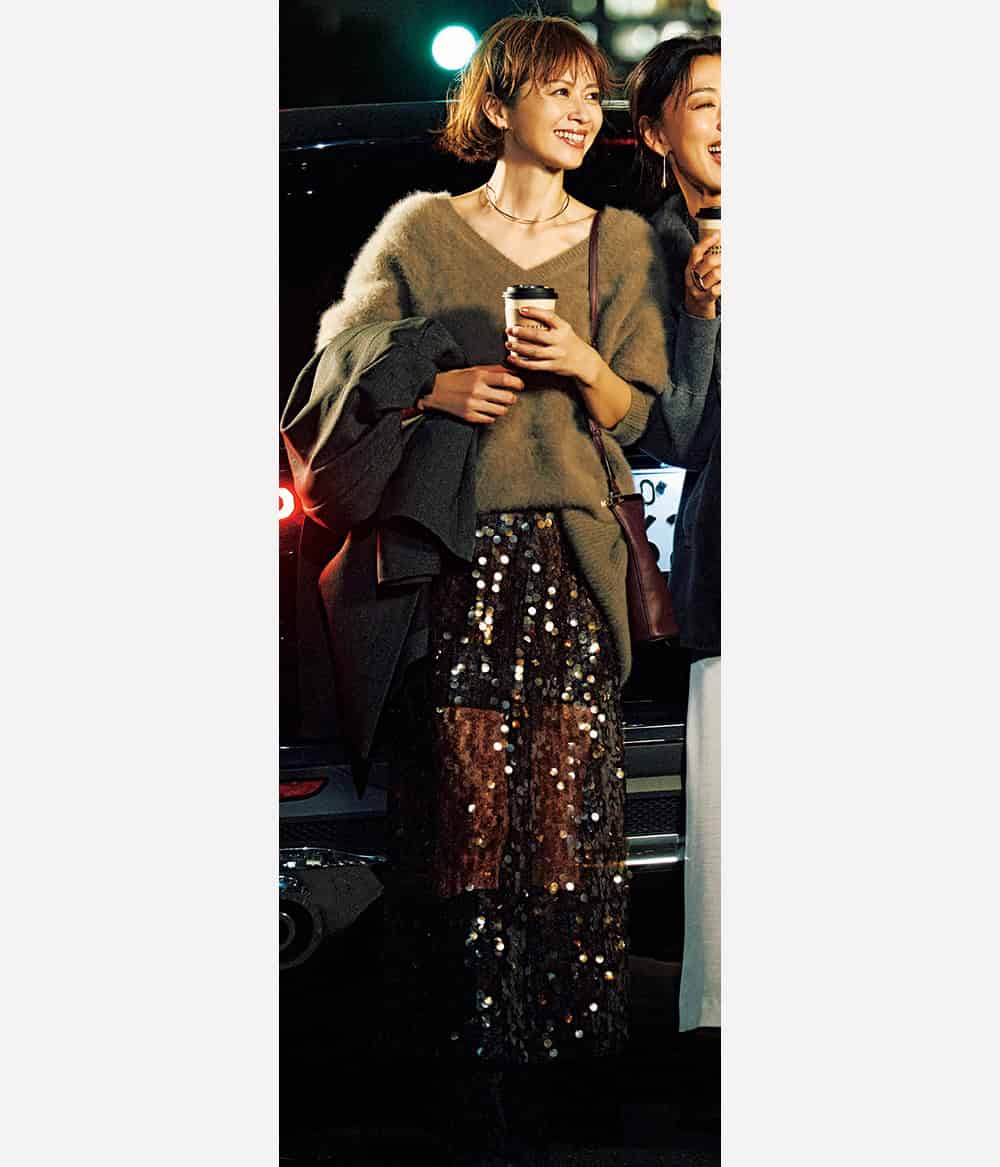 スパンコールとニットの柔らかさで 肩肘張らないオシャレが完成。