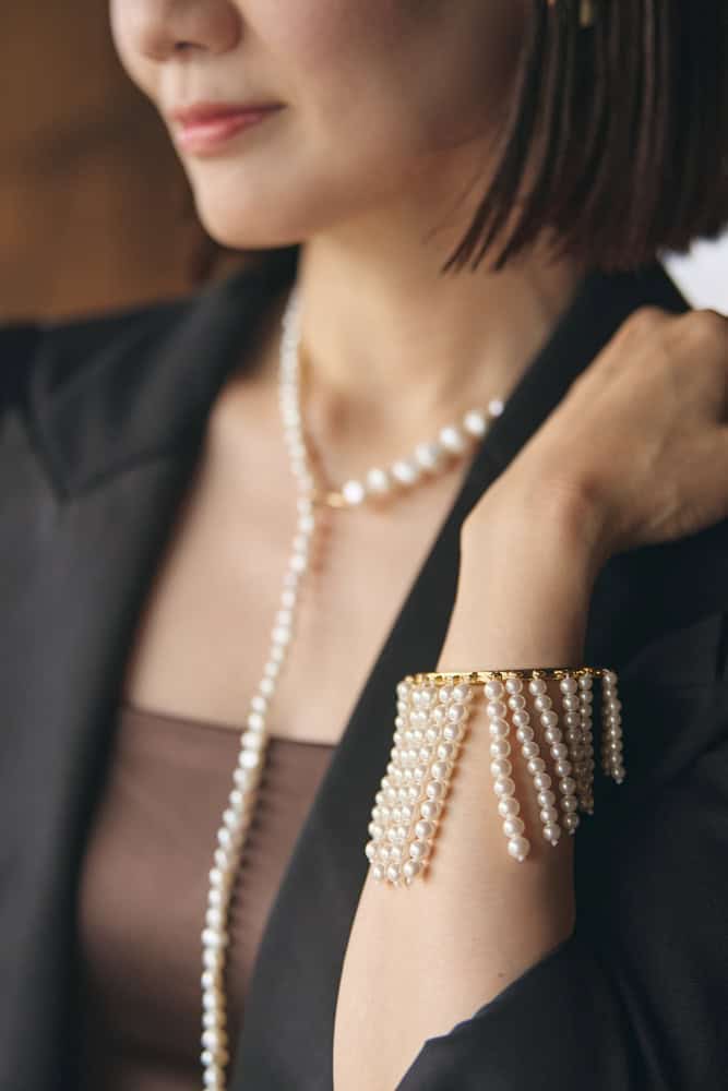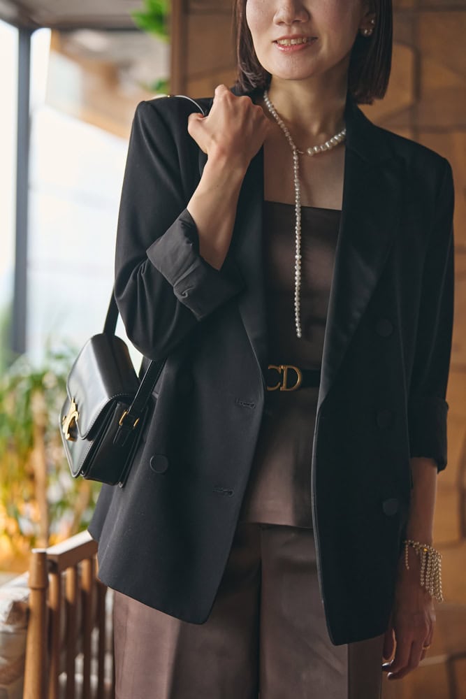 小物以外をZARAとH&Mでまとめたフォーマルなコーディネート。プチプライスも素材や形を重視すれば、着映えも高見えもバッチリです。服装がシンプルな分、アクセは輝きを意識してパールを存分に使うことで個性を引き出します。