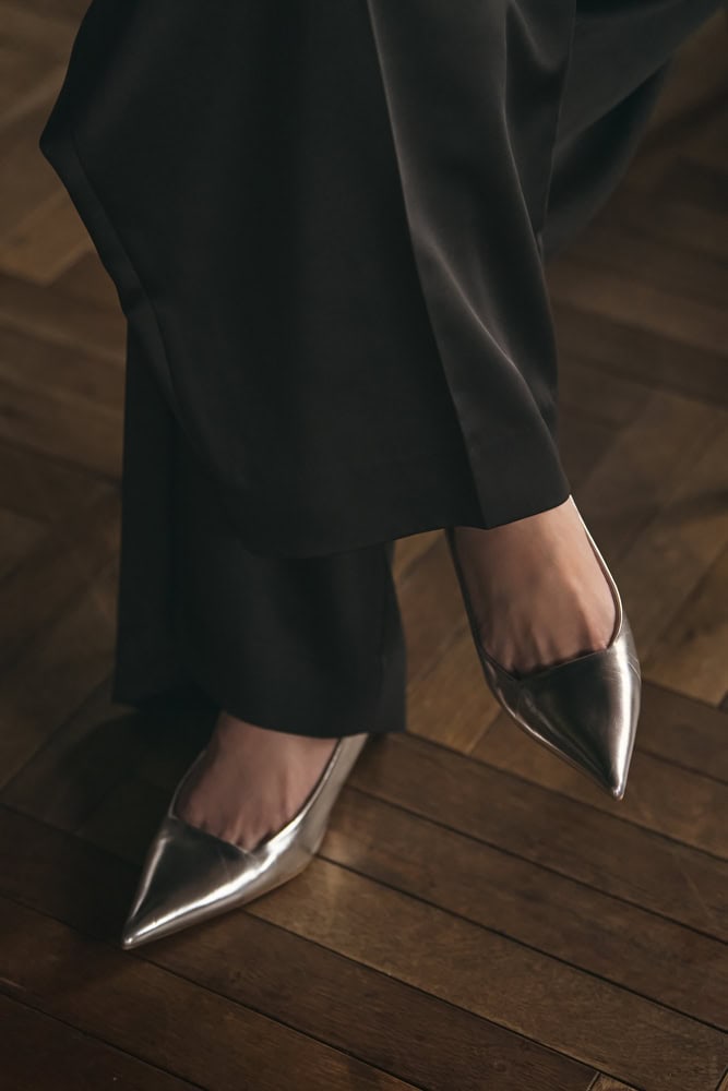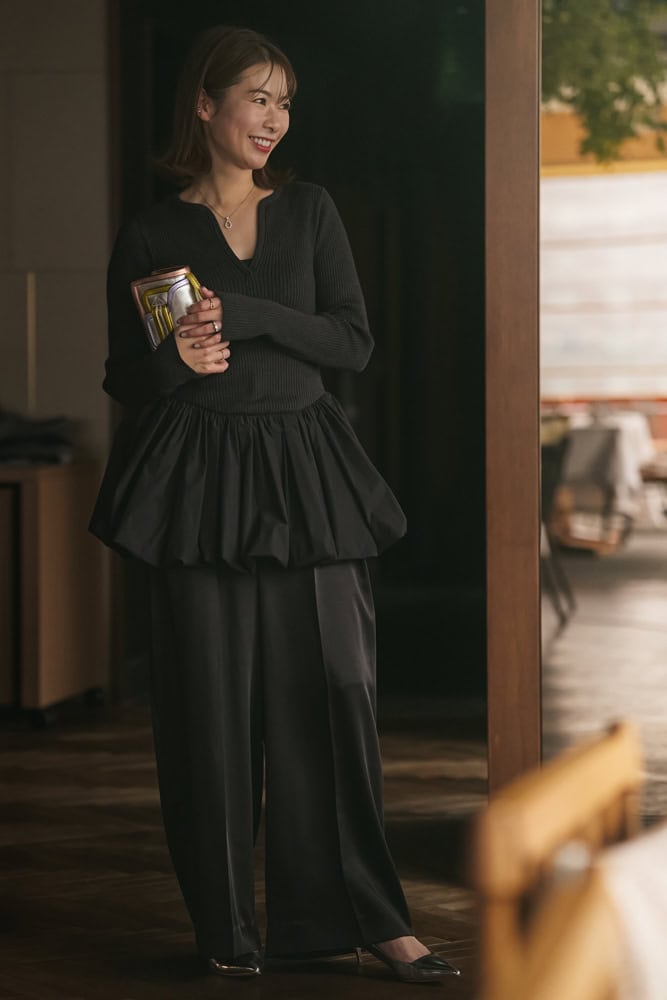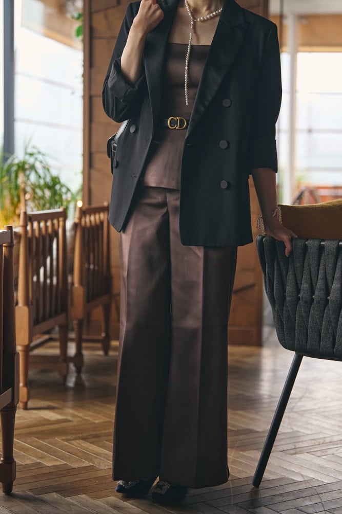 ストンとしたパンツとペプラムの広がりが調和した甘すぎない最先端な着こなしが実現。モードなパンツをメインにおきつつ、柔らかさのあるペプラムが自分らしさを高めます。ALLブラックのシックな組み合わせをZARAのシルバーのパンプスが彩ります。