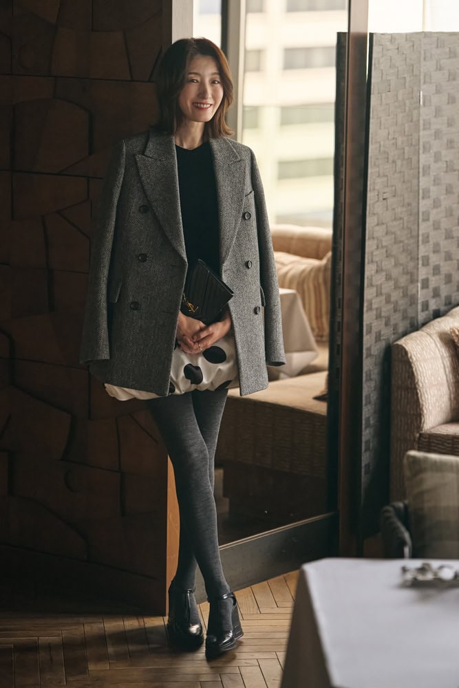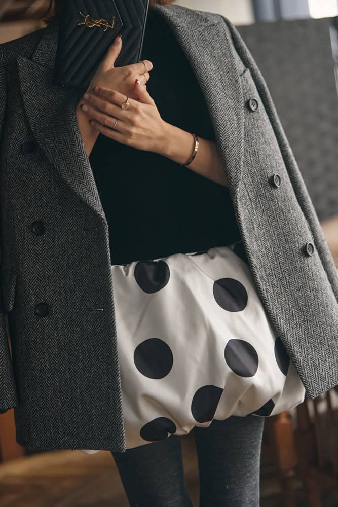 パーティーの日は、いつもと違うキャッチーなデザインを取り入れたい。ZARA&Disneyのバルーンスカートを着るとかっちりとしたニッシュなジャケットや色使いのコーデも非日常の仕上がりにシフトします。丸っぽさとクールさが両立したとびきりの華やぎスタイルです。