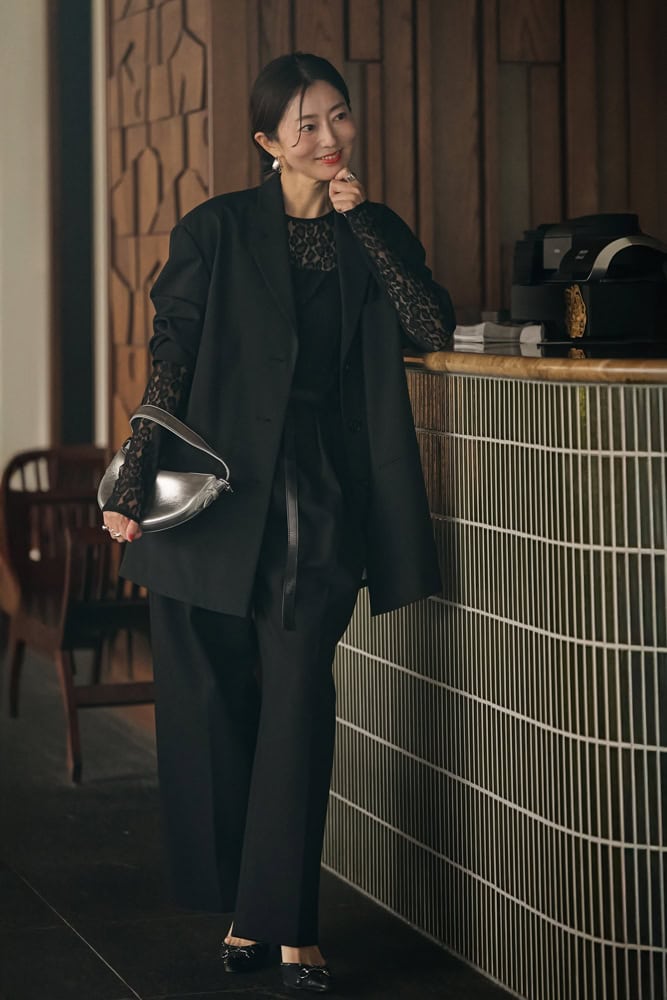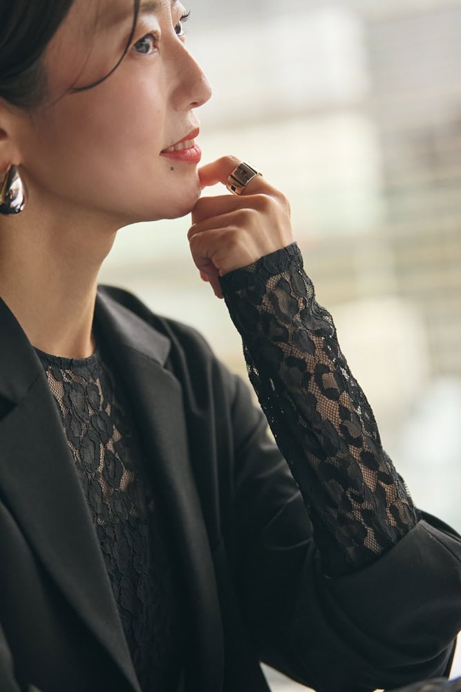 キュートなアニマル柄のシースルートップスでフェミニンを意識。メンズ感の強い黒のジャケパンスタイルに女性らしい柔らかさが生まれます。敷き詰められた柄なので柄の主張が激しすぎず、柄ものが苦手な方でも着こなしやすさ満点です。