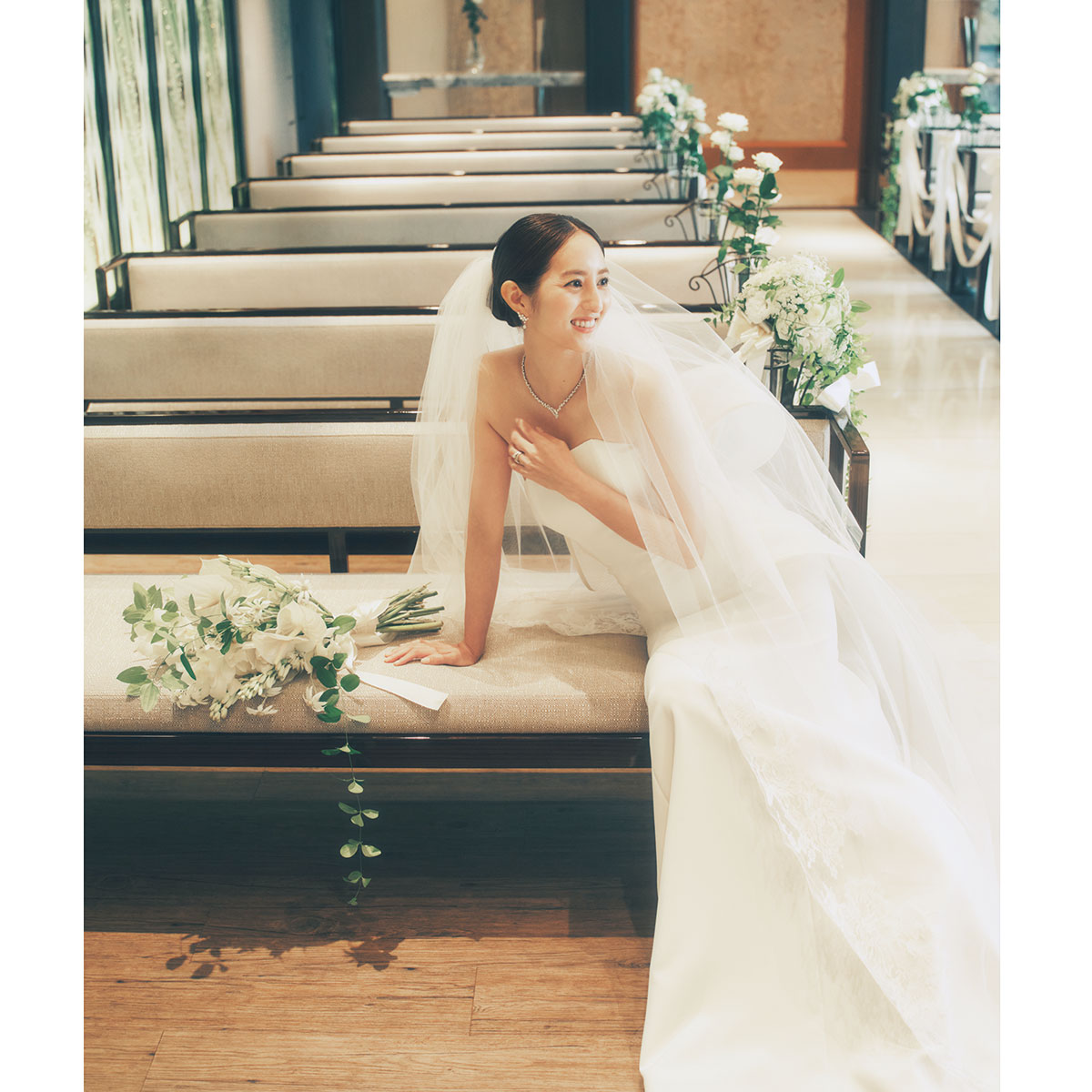 挙式の際に着用したのは華やかさと大人っぽさのバランスが素敵な「アントニオ・リーヴァ」のマーメイドシルエットのドレス。当日までボディラインを磨き上げ、完璧なコンディションで着こなしていました。