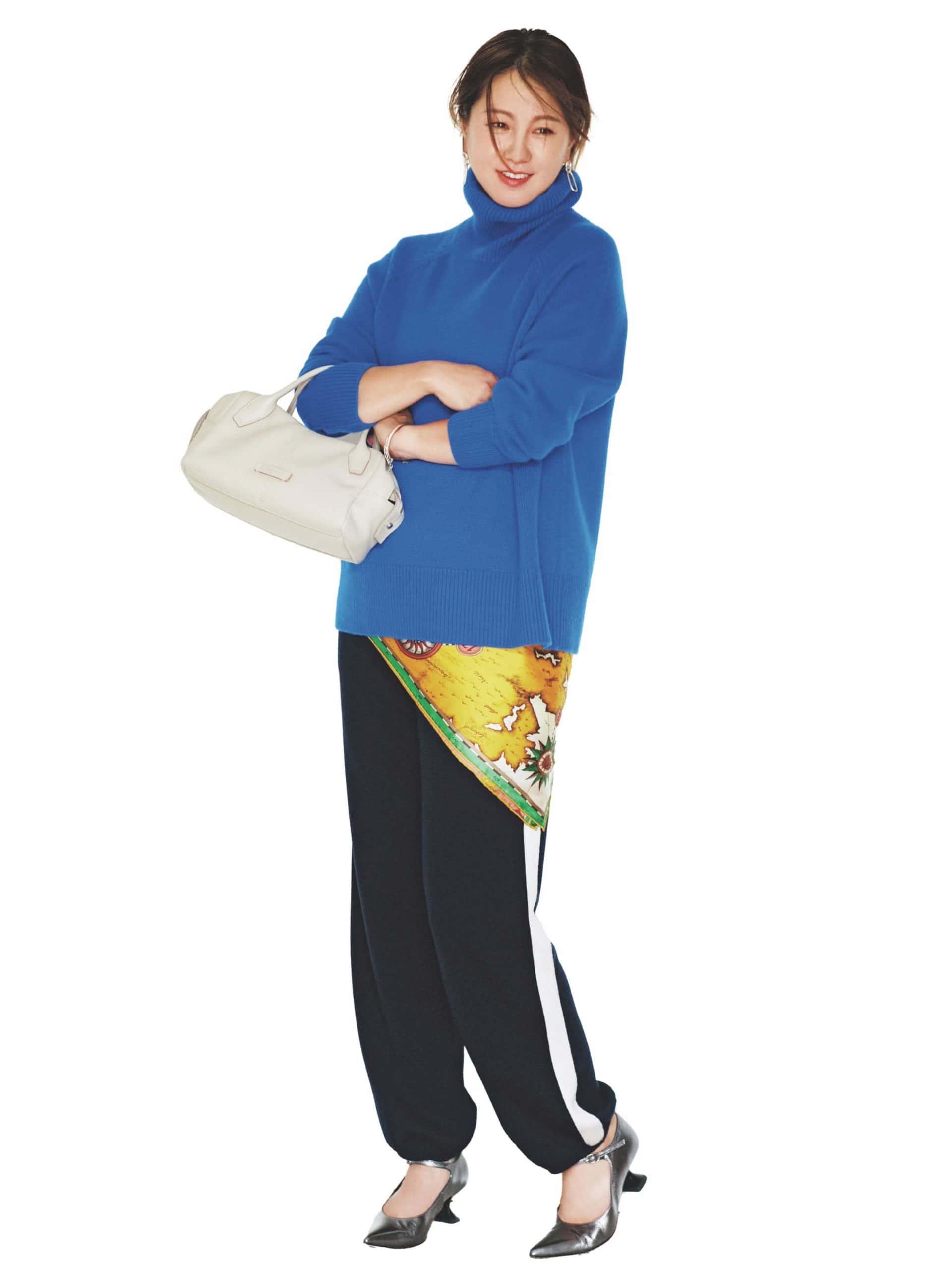 スカーフ¥22,000(マニプリ) ニット¥47,300(エブール/リトルリーグ インク)パンツ¥35,200(ゲミニー/ウィム ガゼット ルミネ新宿店)バッグ¥64,900(ジャンニ キアリーニ/ジャンニ キアリーニ 銀座店)パンプス¥35,200(ペリーコ サニー/アマン)ピアス¥22,000(バルブス/ズットホリック)バングル¥62,150(CHIRO JEWELRY/ロードス)
