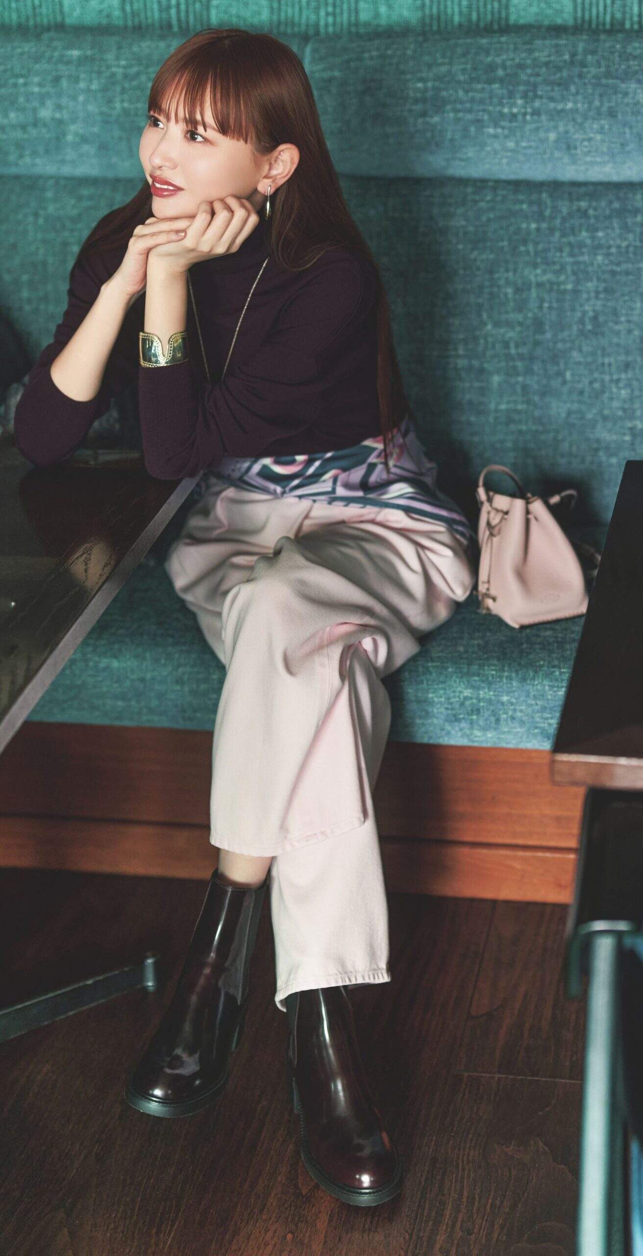 ボルドータートルネックニット¥29,700(サクラ/インターリブ)ピンクパンツ¥30,800(ウィム ガゼット/ウィム ガゼット 玉川髙島屋S・C店)スカーフ¥16,500(マニプリ)バッグ¥152,900ブーツ¥135,300(ともにトッズ/トッズ・ジャパン)ピアス¥48,400(CALLMOON/ショールーム セッション)ネックレス¥110,000(SOPHIE BUHAI/エスケーパーズ アナザーワールド)バングル¥77,000(NOAARK/エスケーパーズオンライン)