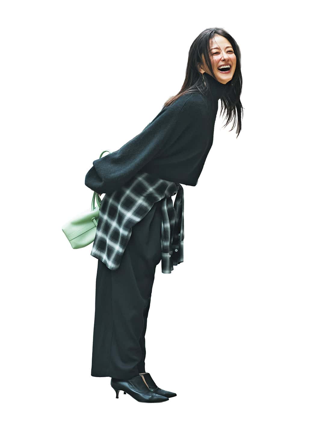 ニット¥46,200(LE PHIL/LE PHIL NEWoMan 新宿店)シャツ¥18,700(emmi/emmi ニュウマン新宿店)パンツ¥26,400(カデュネ)バッグ¥44,000(ヴァジック/ヴァジックジャパン)パンプス¥79,200(ネブローニ)ピアス¥32,560(ソコ/ズットホリック)