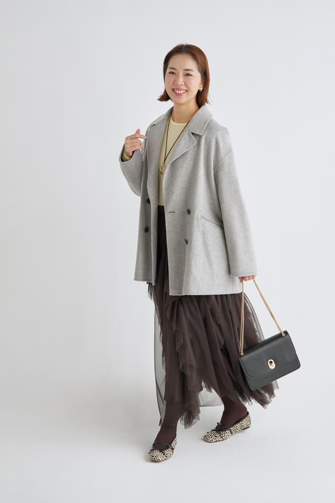 大好きなふんわりスカートはともすると着膨れしがち。肩から落ちるビッグサイズなジャコットを羽織れば、スッキリ見えを叶えつつ甘ニッシュなトレンドコーデが完成します。コート寄りの1枚なら本格的に寒くなってもOKで長いあいだ活躍してくれそう。