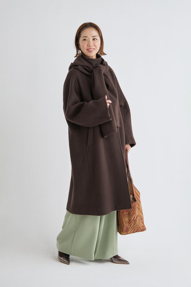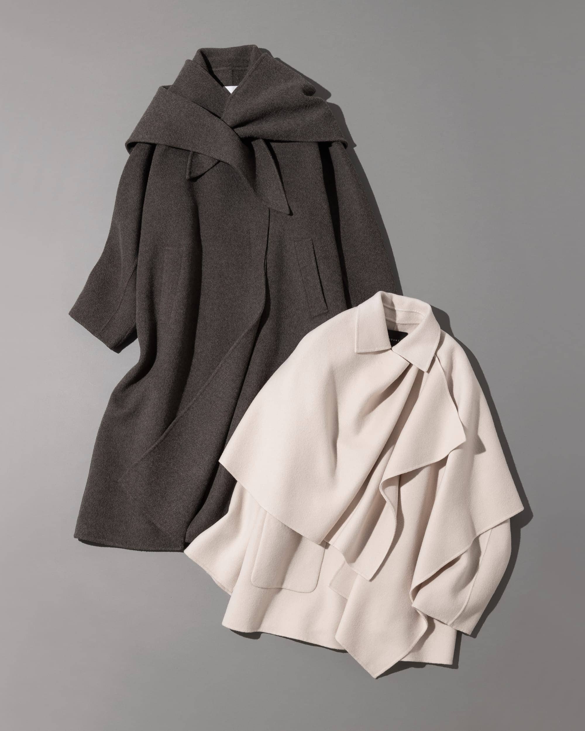 今年多く出ているマフラー付きコートは、顔回りにアイキャッチポイントを作って目線を上げることで体型悩みに目を行かせない、そんな着やせテクニックを活用できます。〈右〉大判ストールのようにいろいろな巻き方を楽しめる1枚。〈左〉ちょこんとついたプチスカーフサイズのマフラーが可愛い存在感を放ちます。