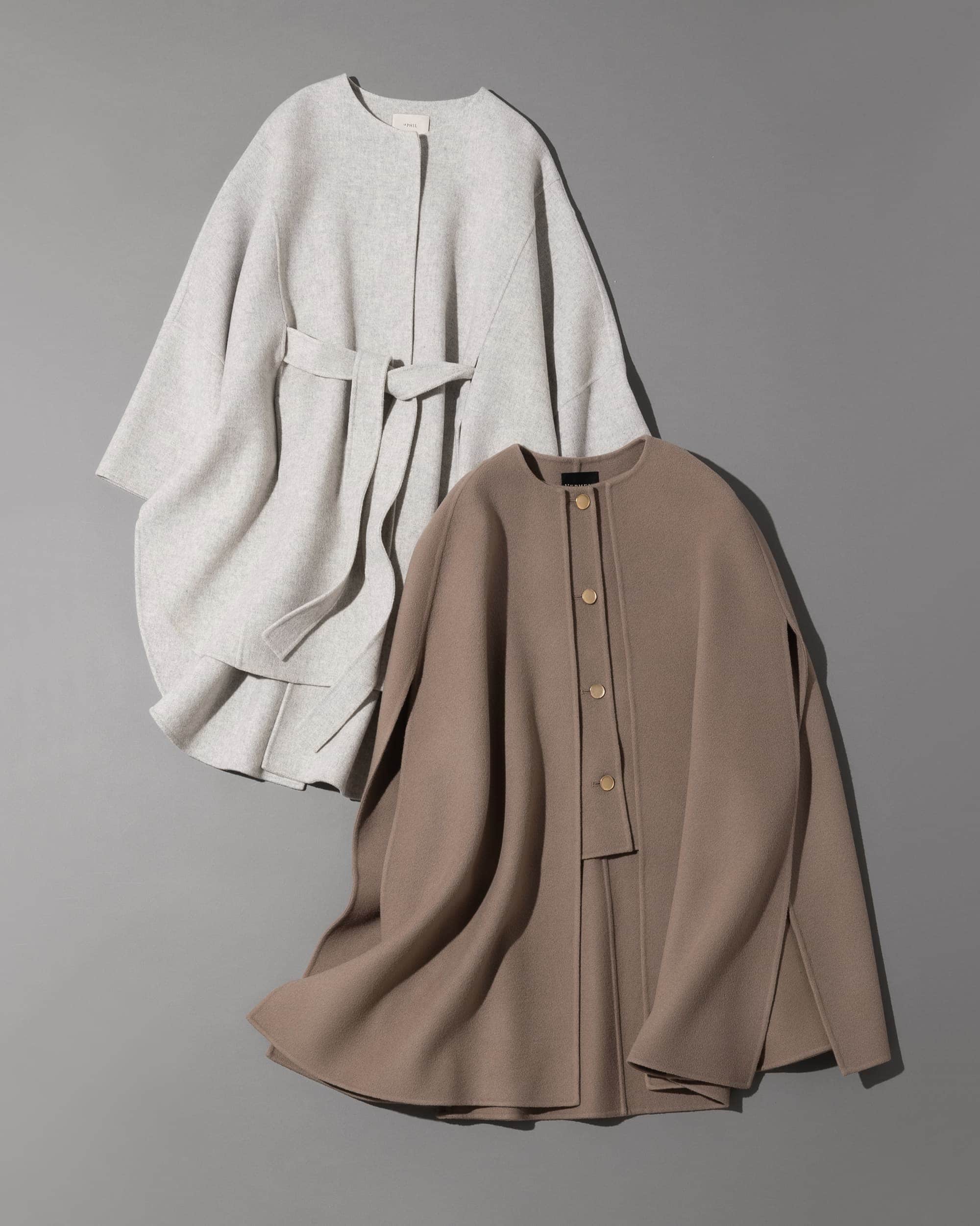 袖ぐりが広くドロップショルダーで肩回りが気にならない、ポンチョ型のアウターは体型カバーの万能選手。長すぎない腰丈くらいまでのものを選べば大柄見えも回避できます。〈右〉ボタン付きの身頃が仕込まれたデザインがレア。〈左〉ロングセラーの人気ポンチョ。袖があるタイプなので防寒力も担保。