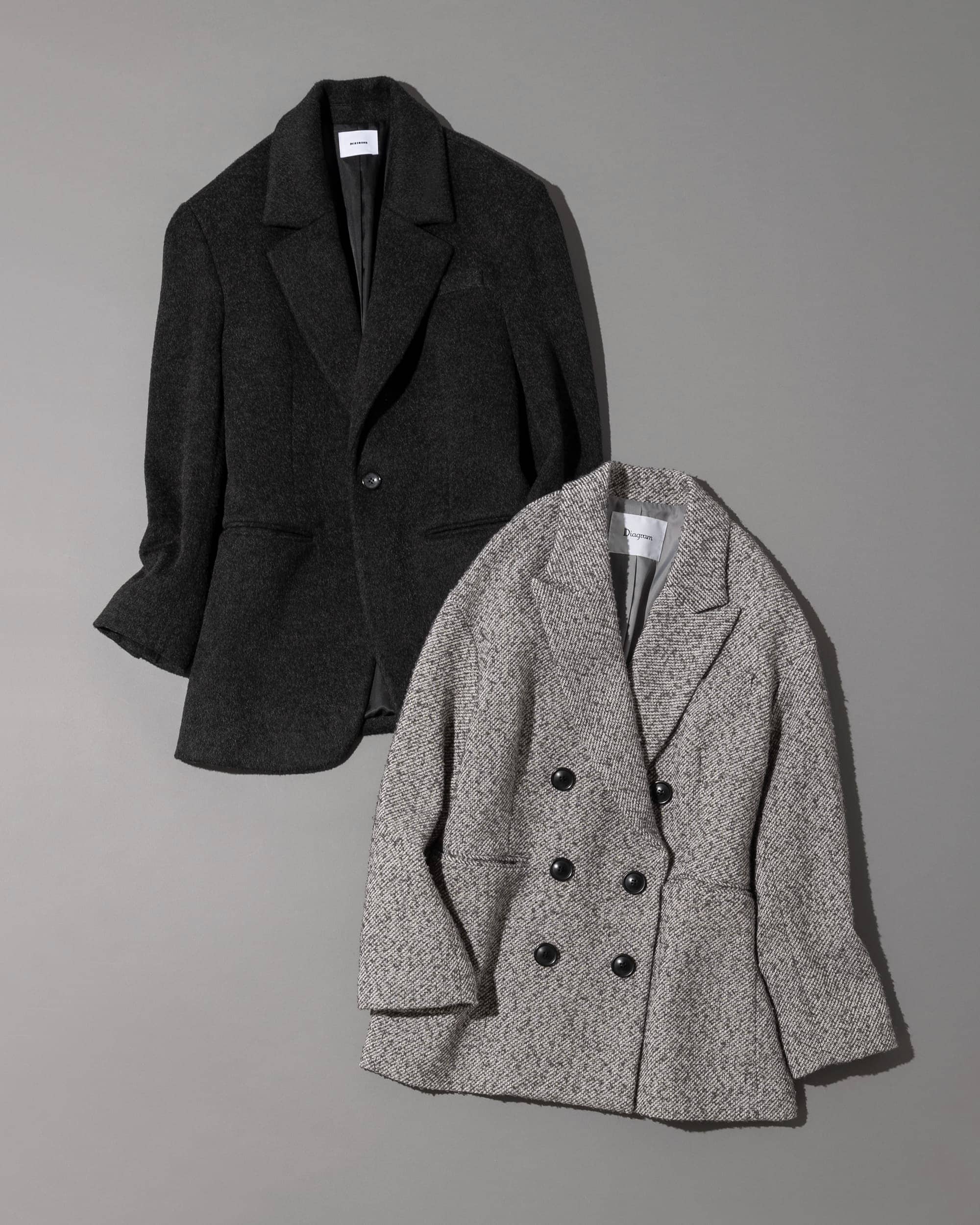 着るだけでトレンド感が手に入るジャコットは肩幅広めがセレクトの肝。肩が落ちるシルエットは上半身の大きさを目くらまししてくれてほっそり見えます。〈右〉ネップツイードの生地感がオシャレ。ダブルブレストをきっちり閉じずに着流すと着やせ効果抜群!〈左〉ほんのりシェイプされたウエストラインも効いています。