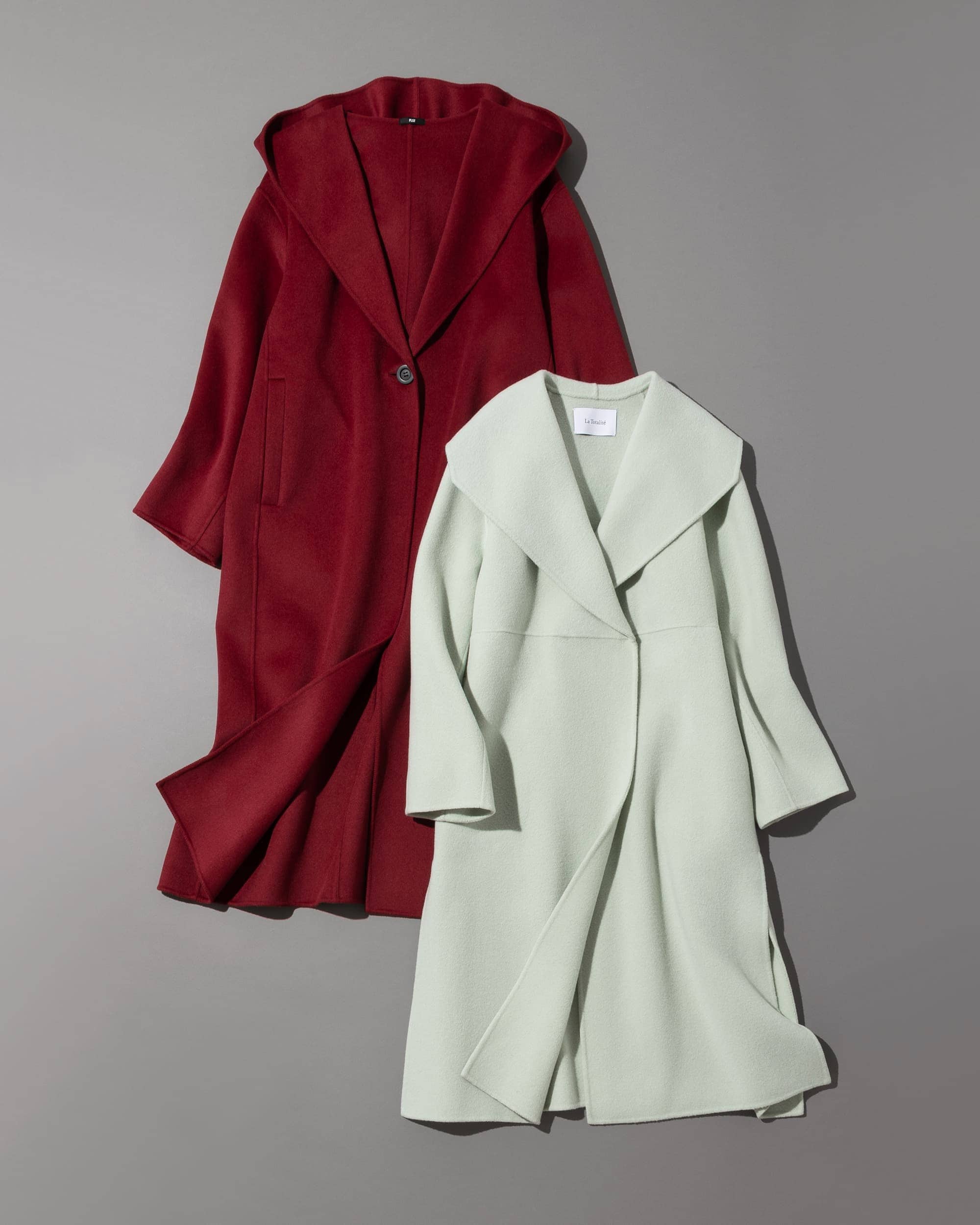 ガウンのようにバサッと着流せるリバーコートは縦のラインを強調してくれるから着膨れと無縁!落ち感が大事だから、とろみのある上質な柔らかい素材のものを選ぶのがポイントです。〈右〉さりげなく入った高めのウエスト切り替えが足長効果も演出してくれます。〈左〉冬の街で映える深紅が素敵。衿から繋がるフードで小顔効果も。