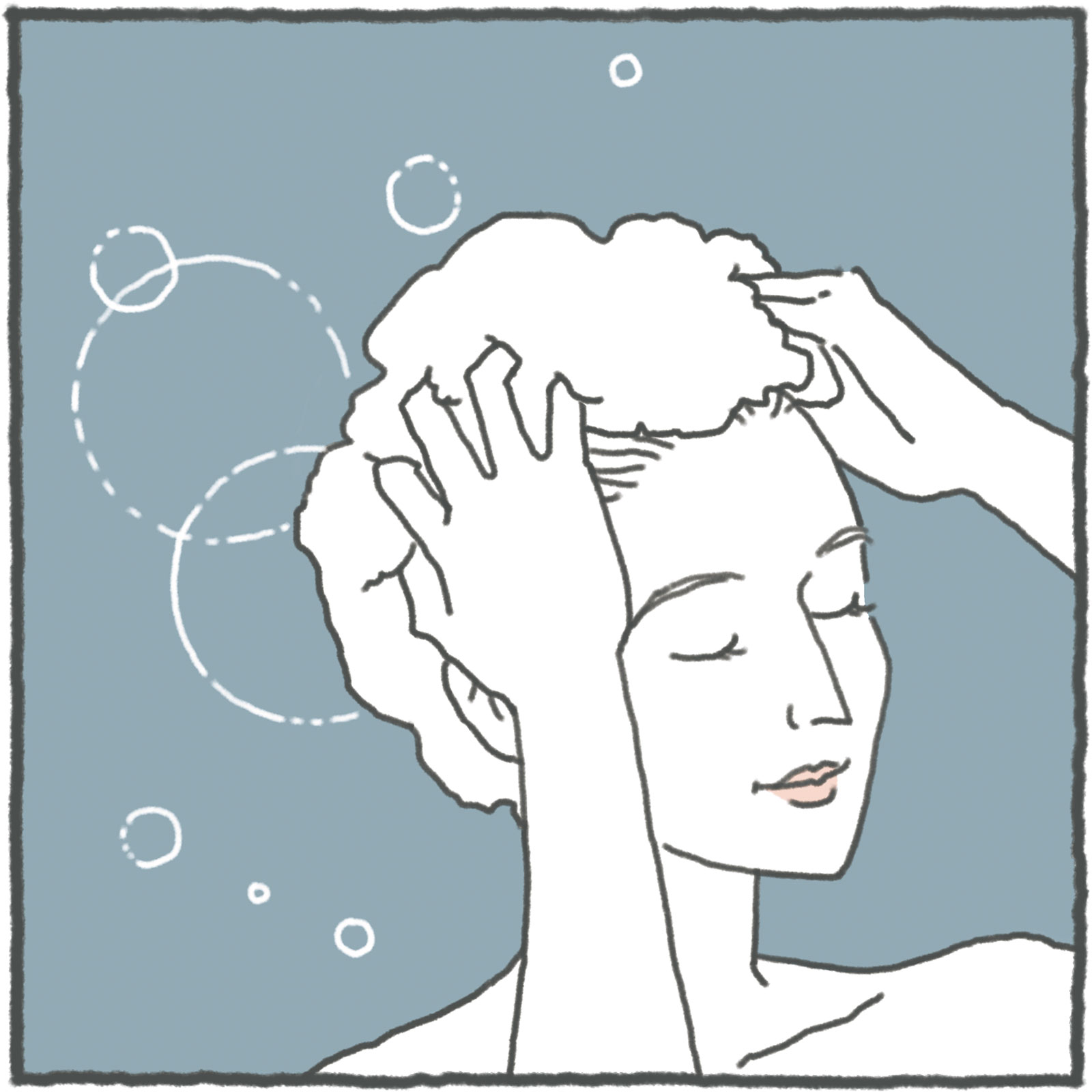 ブラシのプロセスと同様に、5本指を頭皮に当てたら中指が正中線を伝うように指をジグザグ揺らしながら後ろに向かって動かします。