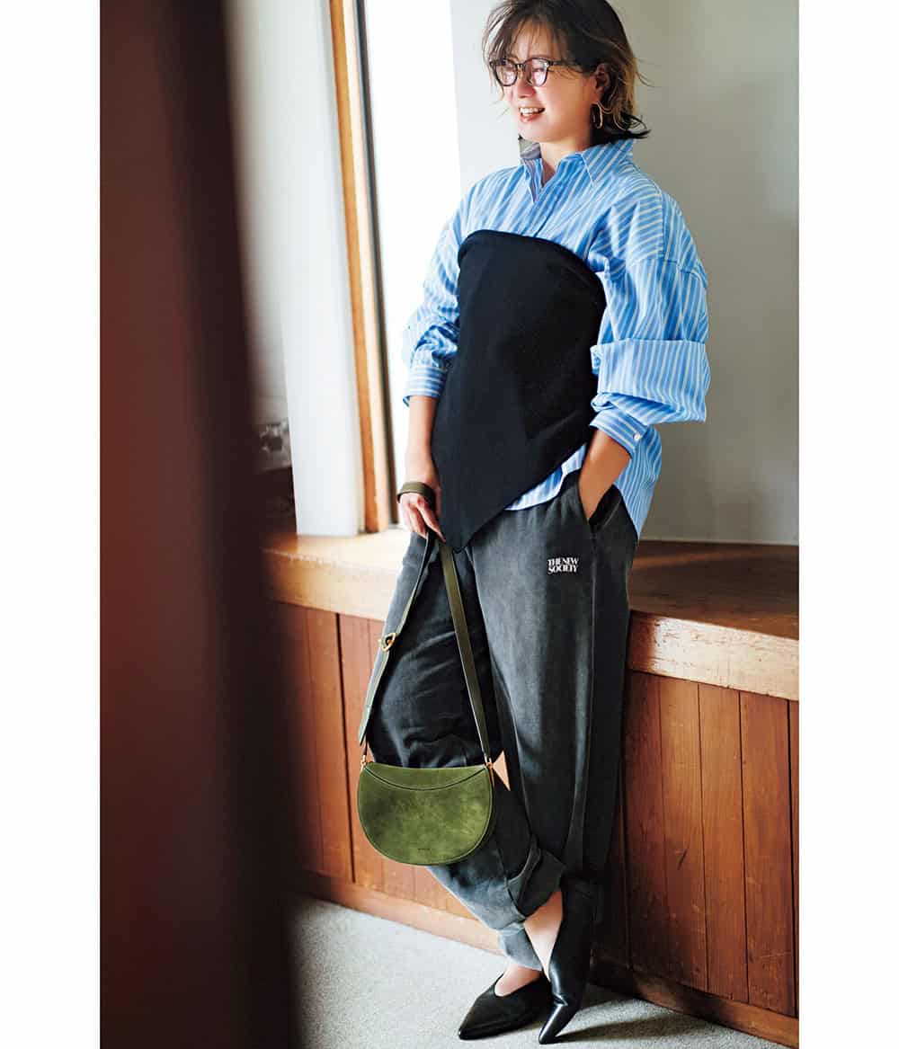 ストール¥14,300(シェアンド/ムーンバット)シャツ¥110,000(ナキユ/ロンハーマン)パンツ¥27,500(ザ ニュー ソサエティ/サードマガジン)バッグ¥161,700(ワンドラー/ブルーベル・ジャパン)パンプス¥36,300(シーセイ/アイネックス)ピアス¥28,380(ソコ/ズットホリック)メガネ¥42,900(プロポ/プロポデザイン)
