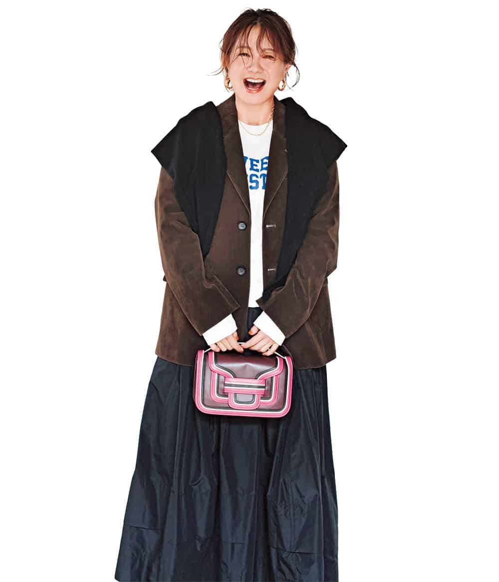 ストール¥14,300(シェアンド/ムーンバット)ジャケット¥34,100(MIESROHE/MIESROHE ルミネ新宿1店)Tシャツ¥11,000(ダブルスタンダードクロージング/フィルム)スカート¥45,100(ロンハーマン)バッグ¥209,000(ピエール アルディ/ピエール アルディ 東京)ピアス¥9,130(エムシー・スタジオ/ズットホリック)ネックレス¥15,950(ココシュニック オンキッチュ/ココシュニック)