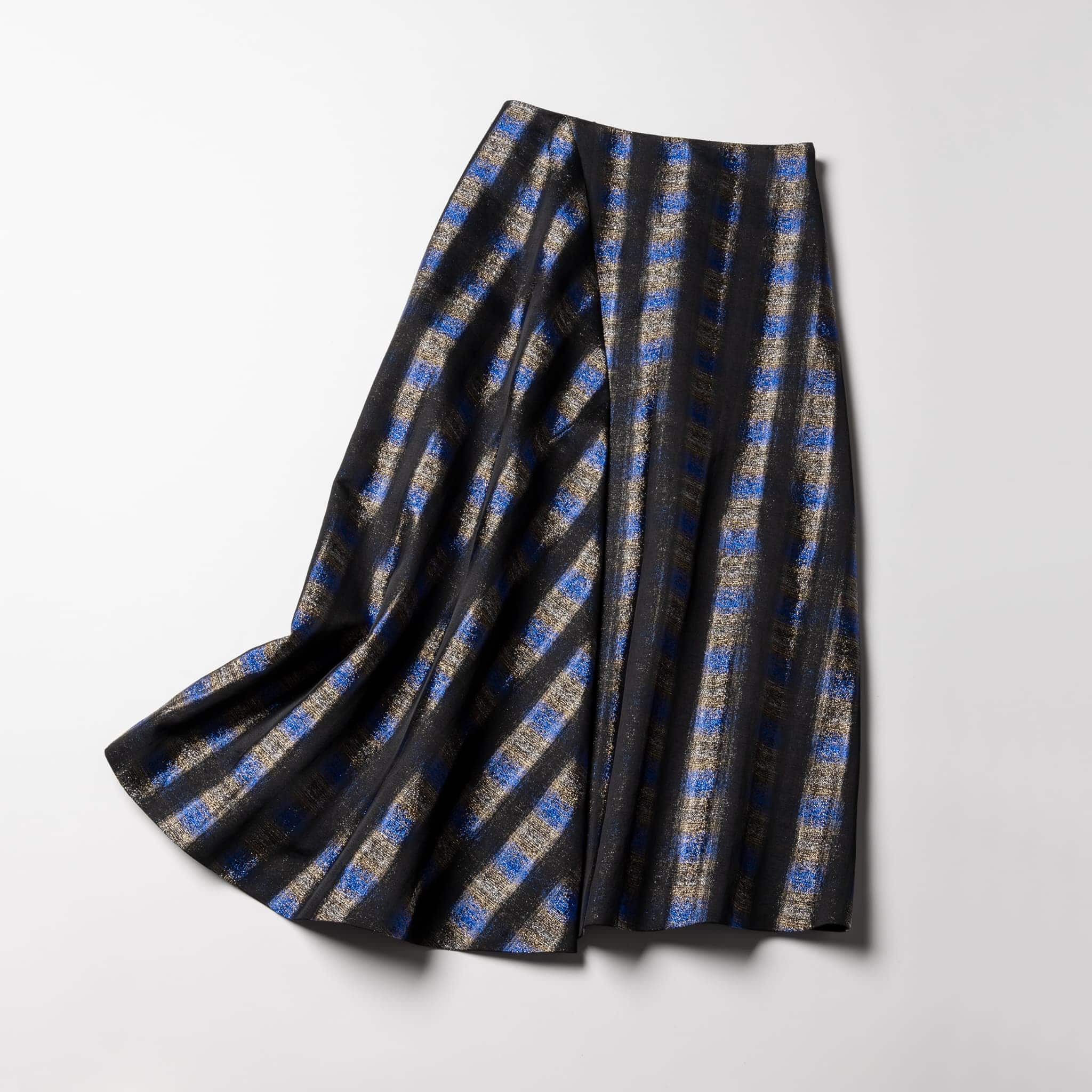 今期のトレンドのひとつであるチェック柄ですがともするとほっこりしがち。こちらの1枚はちょっと派手かな?くらいのパキッとした色合わせと贅沢な光沢のお陰でほっこりとは無縁!切り替えデザインが大人っぽくモードに着られます。シンプルな黒ニットやスウェットを合わせるだけでレイヤードなど難しいテクニック要らずで華やげる、ホリデーシーズンにぜひ手に入れたい1枚です。