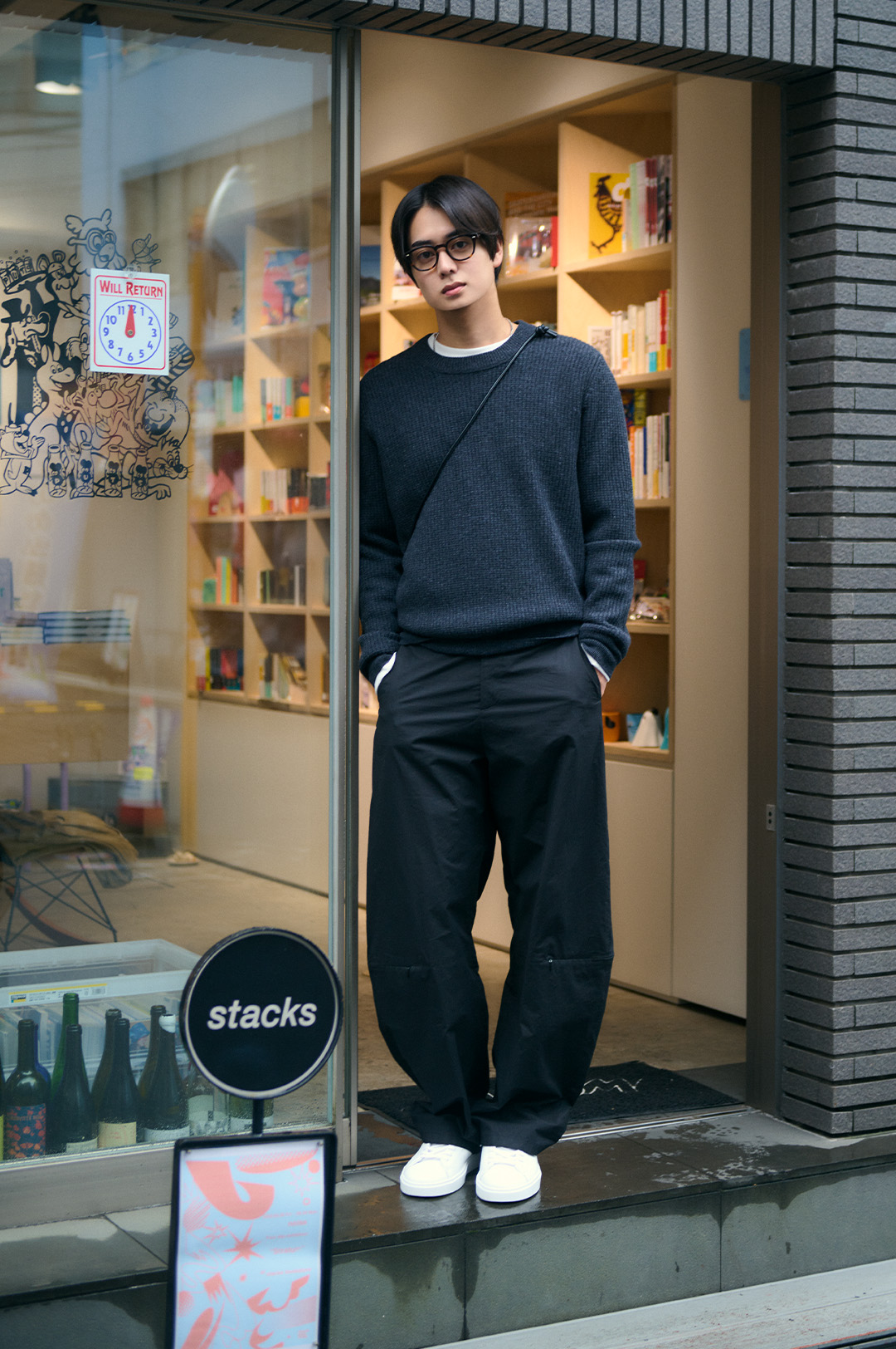 ニット¥30,000(バナナ・リパブリック)中に着たカットソー¥9,240(L.L.Bean Japan Edition/L.L.Bean カスタマーサービスセンター)パンツ¥45,100(AMOMENTO)バッグ¥6,600(remer/remer store)靴¥35,200(デイト/ティースクエア プレスルーム)メガネ¥42,900(アイヴァン/アイヴァン 東京ギャラリー)ネックレス¥3,300〈ライオンハート〉リング¥55,000〈シンゴクズノ〉(ともにSian PR)
