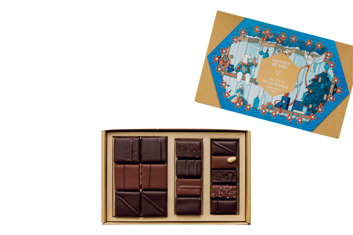 12種類のボンボン・ショコラの詰め合わせ。産地ごとの風味やフルーツフレーバー、プラリネなどクリスマス限定の特別な味を楽しめる。コフレ・ド・ノエル 15個詰め合わせ¥7,236/ル・ショコラ・アラン・デュカス