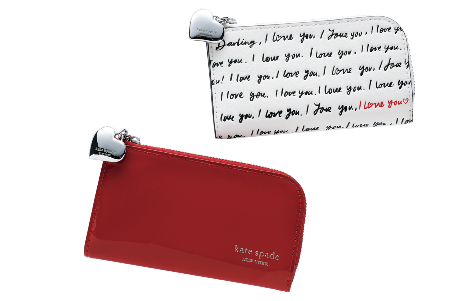 新年からの相棒にお財布を新調するのはいかが? L字ファスナーのコンパクトサイズが使いやすい。I Love youの文字が印象的なデザインも、存在感抜群の赤いエナメルも素敵。ミニウォレット各¥26,400/ともにケイト・スペード ニューヨーク(ケイト・スペード)