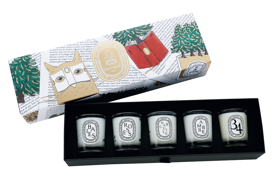 キュートなネコが描かれたボックスにもワクワクさせられる。5種類の人気キャンドルを一挙に楽しめる贅沢なセット。ミニキャンドル 35gセット 5種¥14,740※限定発売/ディプティック(ディプティック ジャパン)