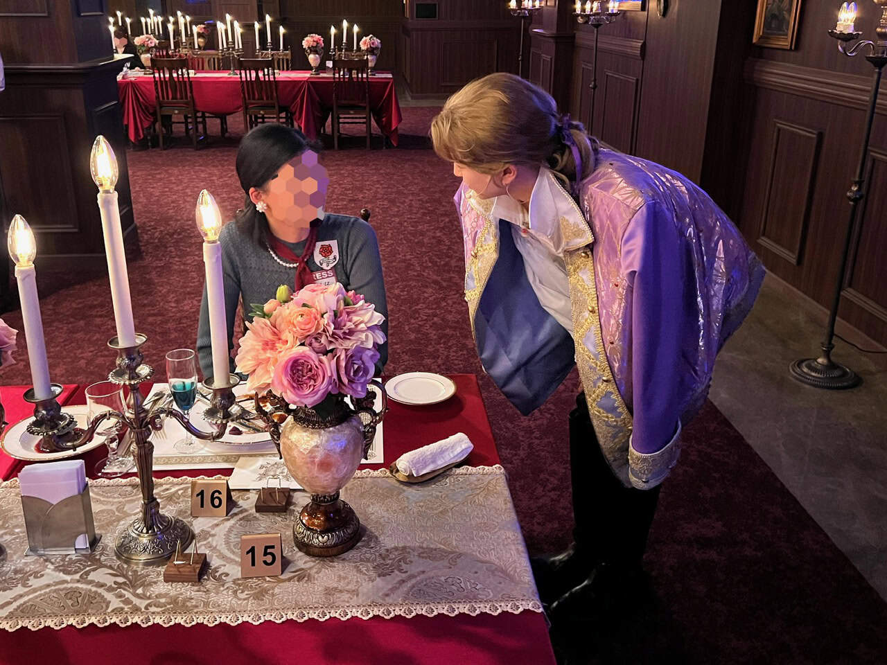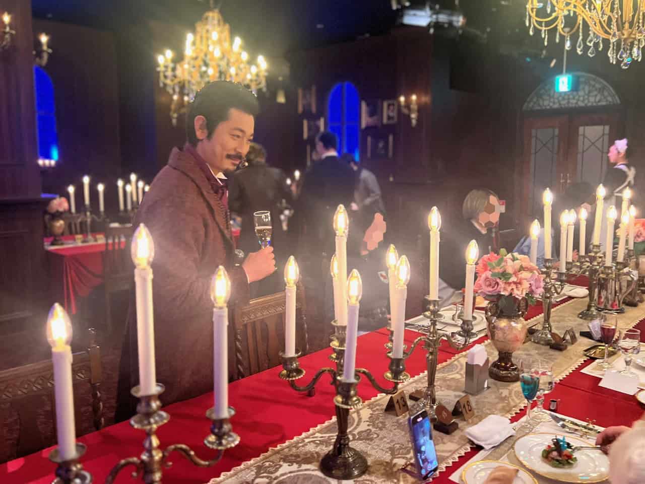 登場人物が同席して、話しかけてくれるので、物語の役になりきりながら食事を楽しむことができます。晩餐会の食事の時間のみ撮影も可能になります。