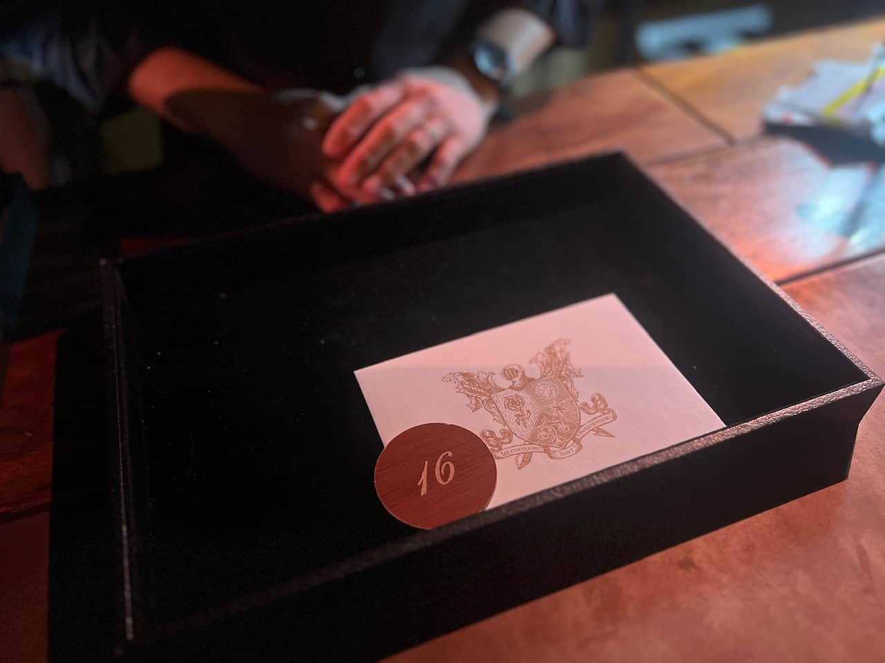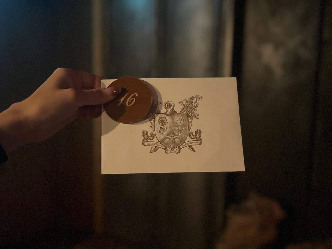 バーカウンターの受付で番号と招待状を受け取ります。始まる前に封筒を開けて自分の役柄を確認します。他の人に見せたり、交換するのはNG。