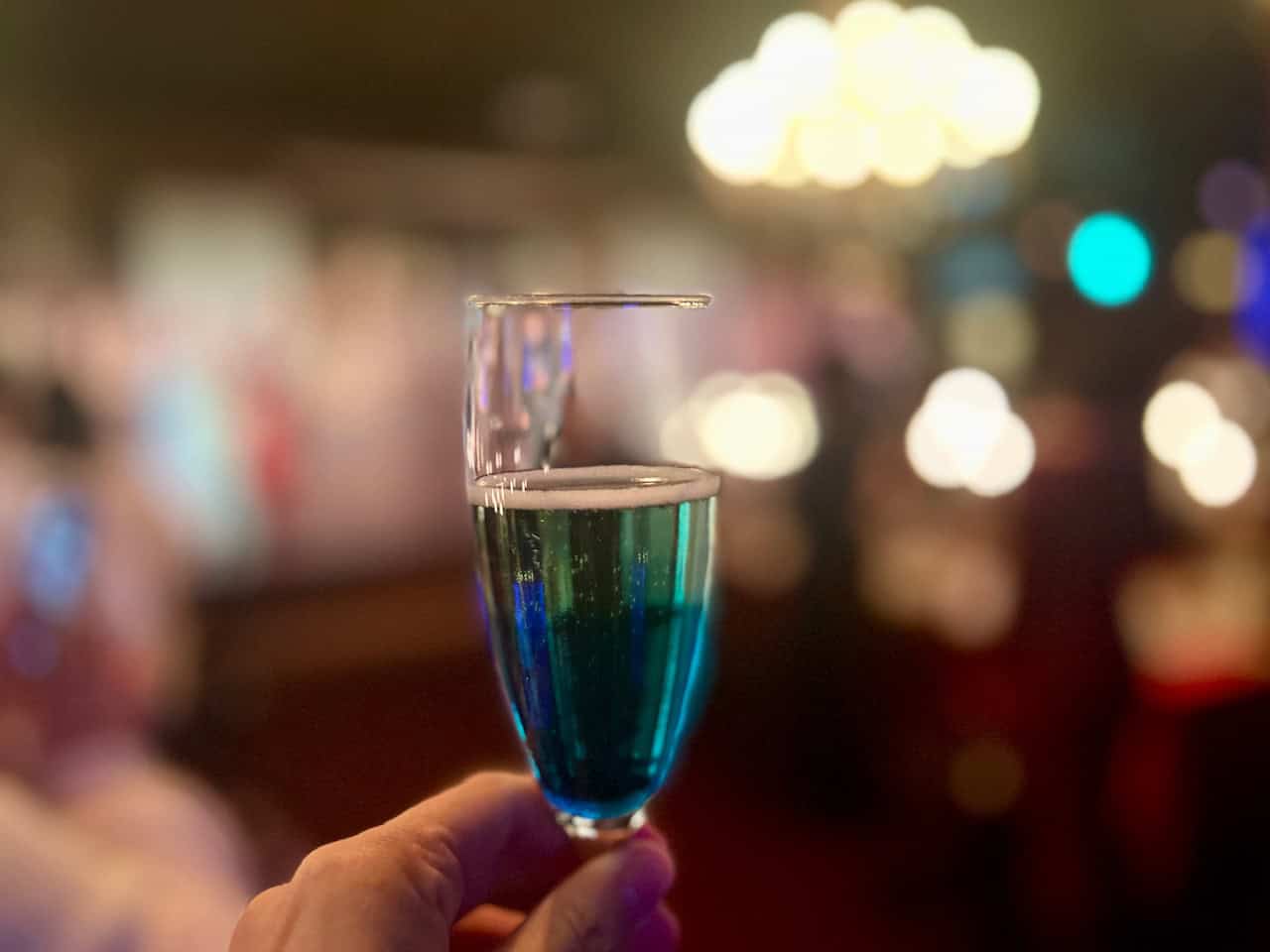 食事の前に怪しく輝く美しいブルーの色のシャンパンで乾杯します。