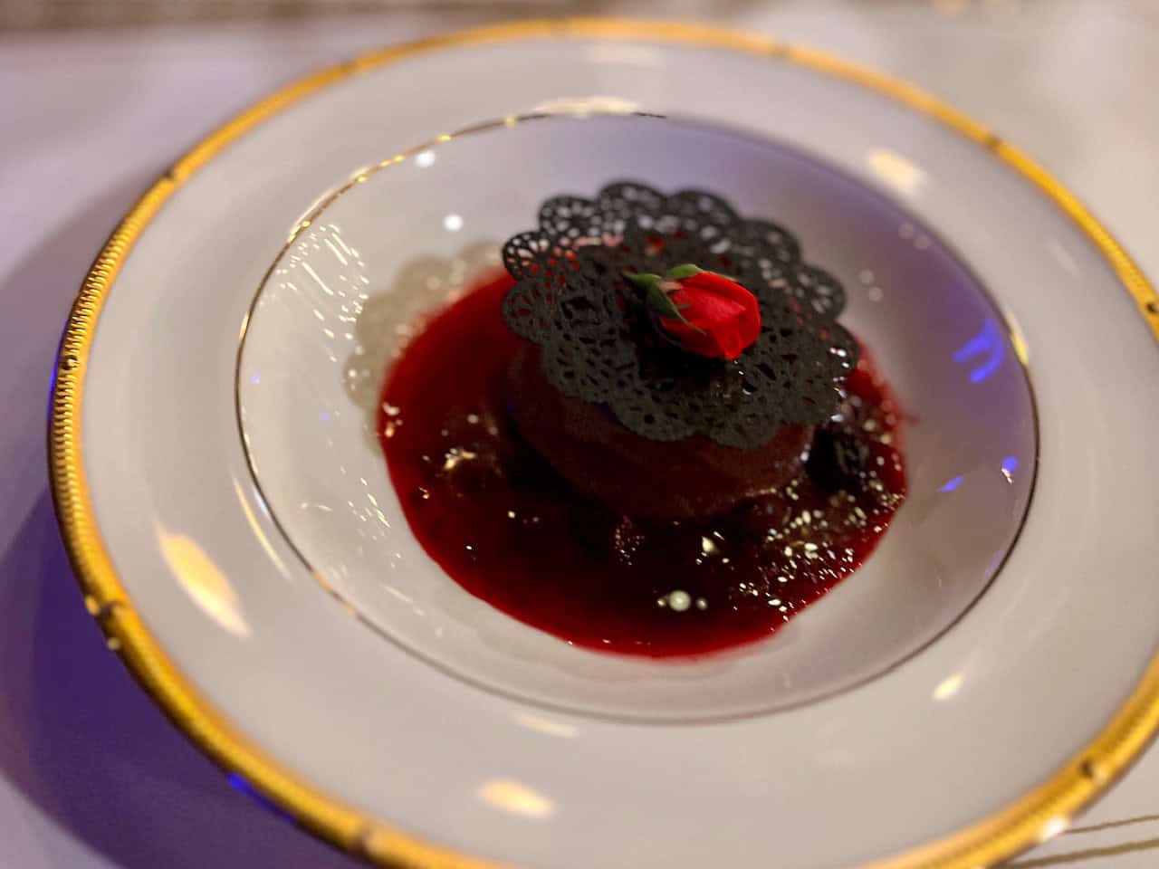 最後のデザートは、繊細なレースのクッキーと添えられた薔薇の蕾が華やかなチョコレートムースでした。一番ボリュームがあり、濃厚なしっかりした甘さのあるチョコレートで、満足感のある一品でした。