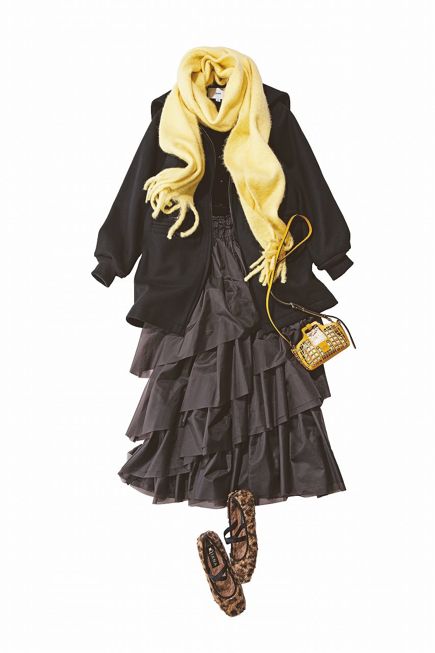 顔まわりにふんわり暖色を効かせて冬の黒を一気に軽やかに。もこもこのイエローマフラーが可愛げを引き上げ、ティアードスカートで甘さもキープ。足元はシックにまとめて大人らしさを忘れずに。