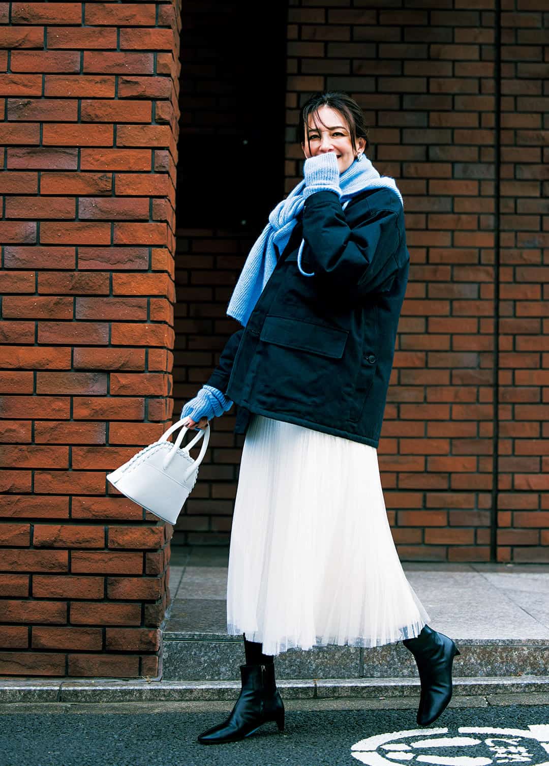 ボリューム感のあるホワイトアウターも、インナーをすっきりまとめれば好バランスに。シャギースカートが上品な可愛さを添えながら暖かさもきちんと確保。柔らかな大人の雰囲気に仕上げた着こなしです。