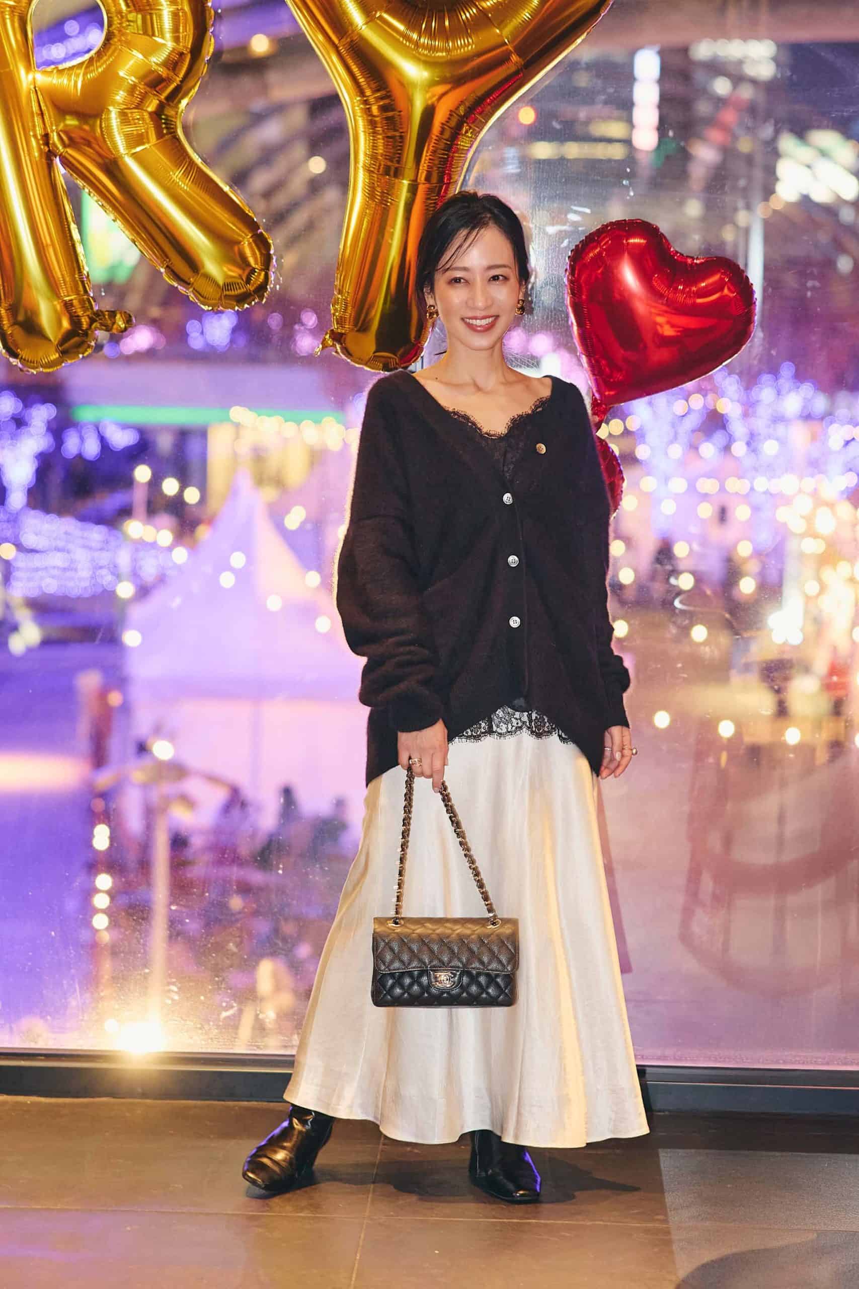 初めての STORY 忘年会は何を着ていこうか悩みましたが、初対面の方も多くいらっしゃるので、ガラッと雰囲気を変えるよりいつもの延長戦上で華やぐコーディネートを意識。自分らしいフレンチシックをベースに、フォックスファーのカーディガンやヴィンテージサテンのスカートなど素材感で華やぎを演出しました。服に合わせ、オイルやハイライトで髪やデコルテに艶を仕込んだのもポイント!