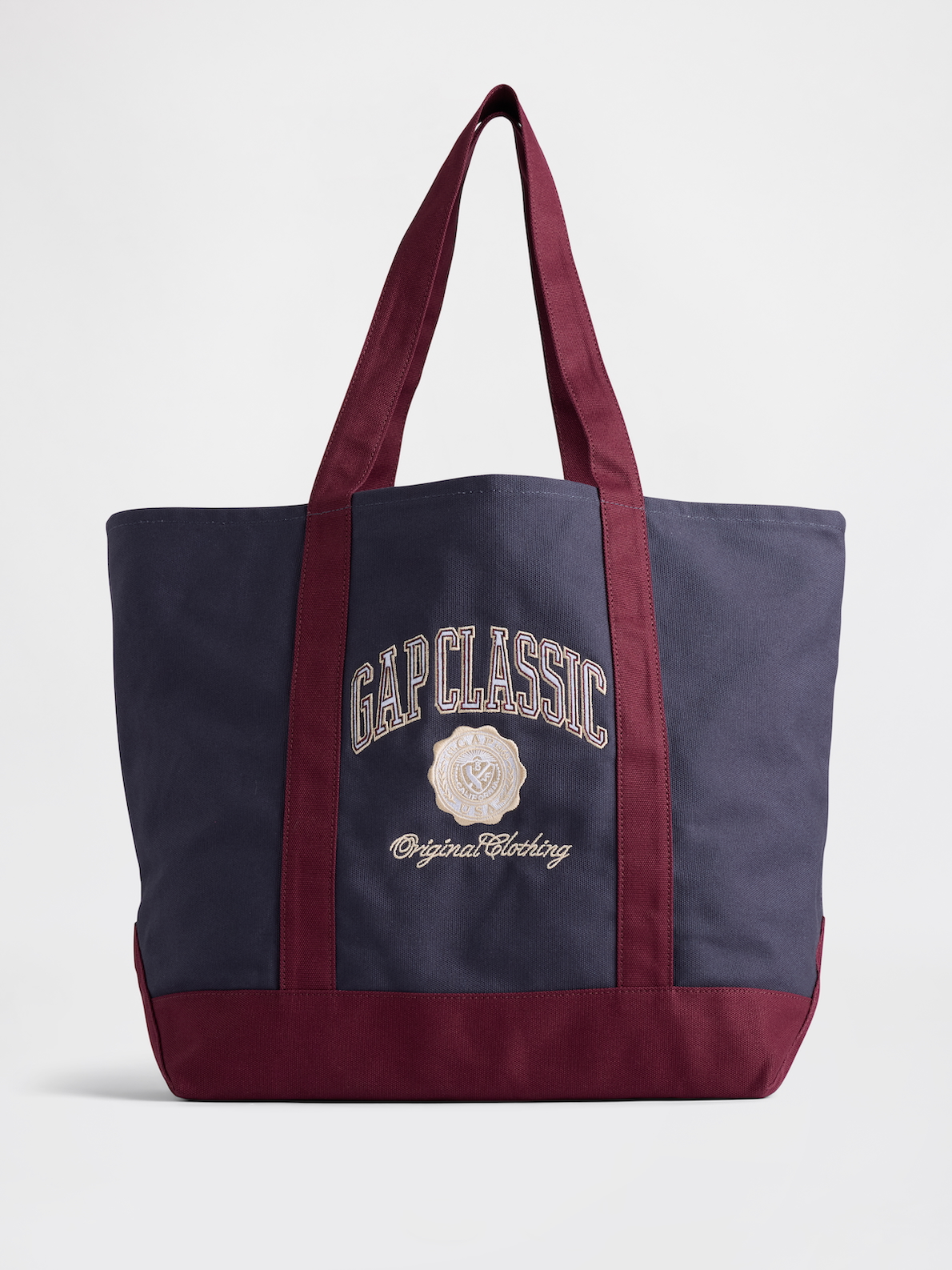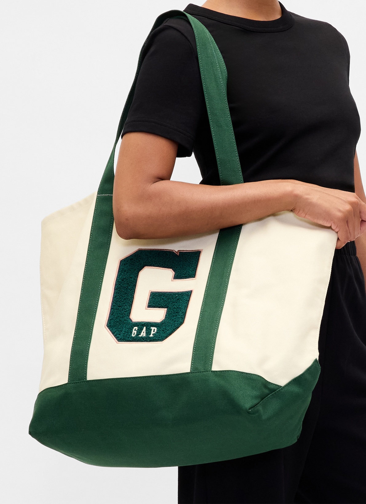 旬のスポーティスタイルにもピッタリな、Gapのカレッジデザインのトートバッグ。遊び心の効いたデザインだけでなく、優しく心地良い肌触りのコットンキャンバス地で、気負わず快適に持てるのが嬉しいポイント。縦幅・横幅・マチと、いずれもしっかりあるサイズ感なので、大荷物の旅行でも安心です。