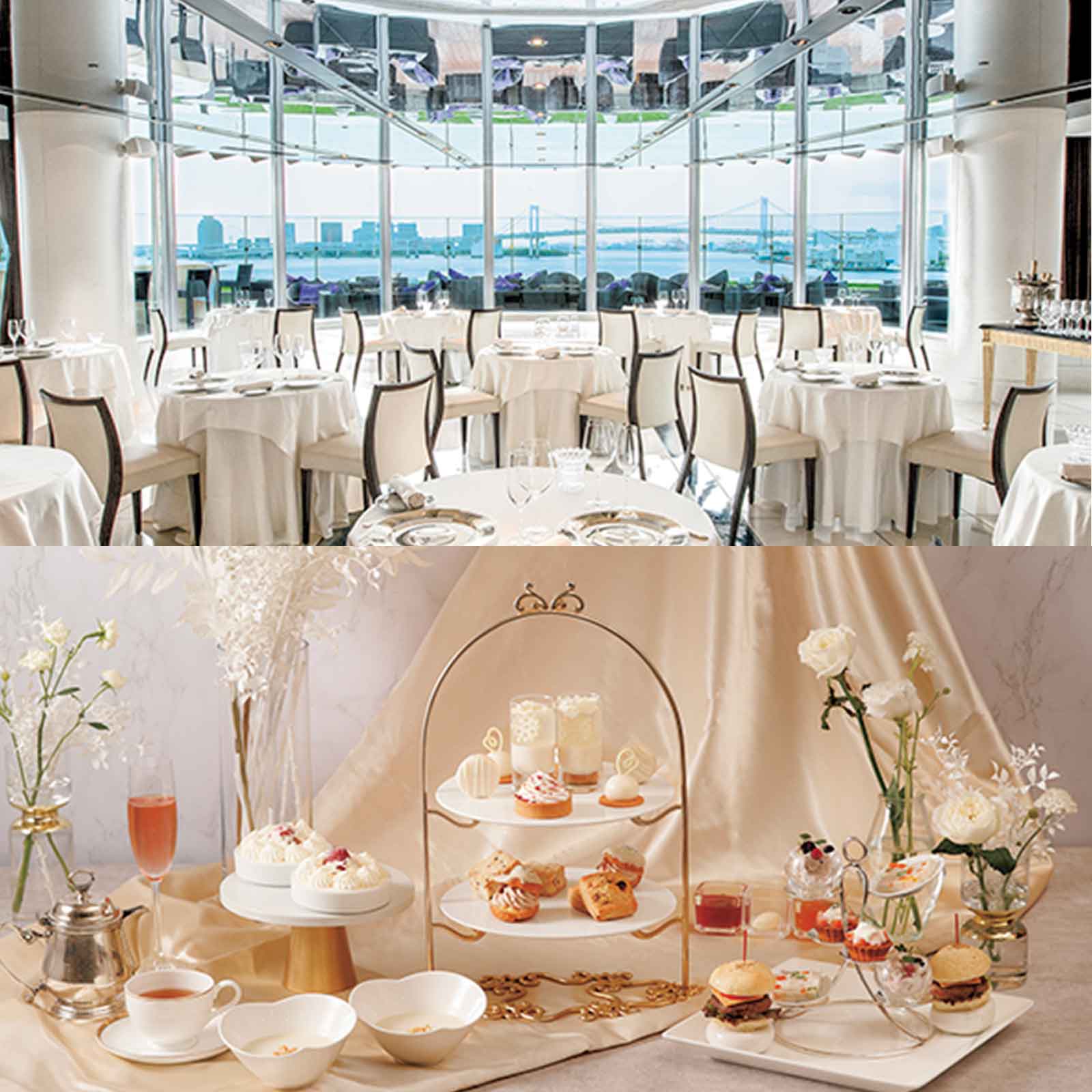 レインボーブリッジをはじめ東京湾岸の景色を堪能しながら、季節のアフタヌーンティーが楽しめます。リュクスたちがいただいたのは雪のように真っ白なスイーツとセイボリーをラインナップした「スノーホワイトアフタヌーンティー」(平日¥6,380/土日祝¥7,480・サ別)。スノーホワイトショートケーキも豪華で、ジャガイモのポタージュや特製ハンバーガーなど、セイボリーも充実の内容です。※内容が変更となることがございます。ご了承ください。