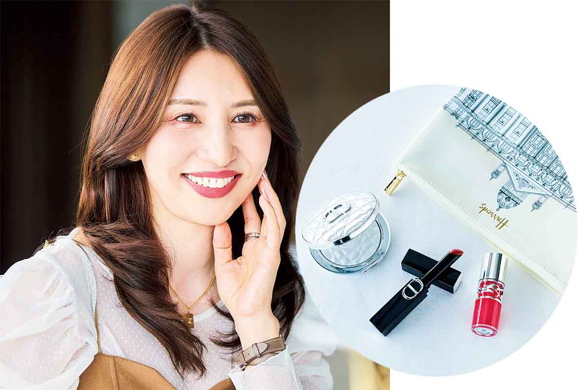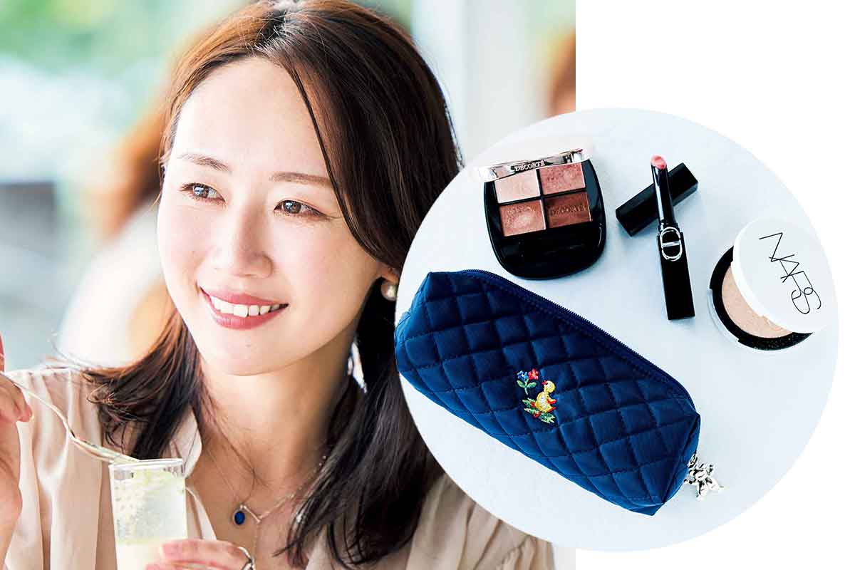 落ちないと発売前から話題になっていたディオールリップは、ピンクカラーを迷わず購入!肌馴染みのいいコスデコのブラウンシャドウ01、透明感がUPするNARSのハイライト03959で、爽やかな印象に。女子会ではいつも以上に明るくヘルシーに見せることを意識します。娘とお揃いのフェイラーのポーチが最近のお気に入り。