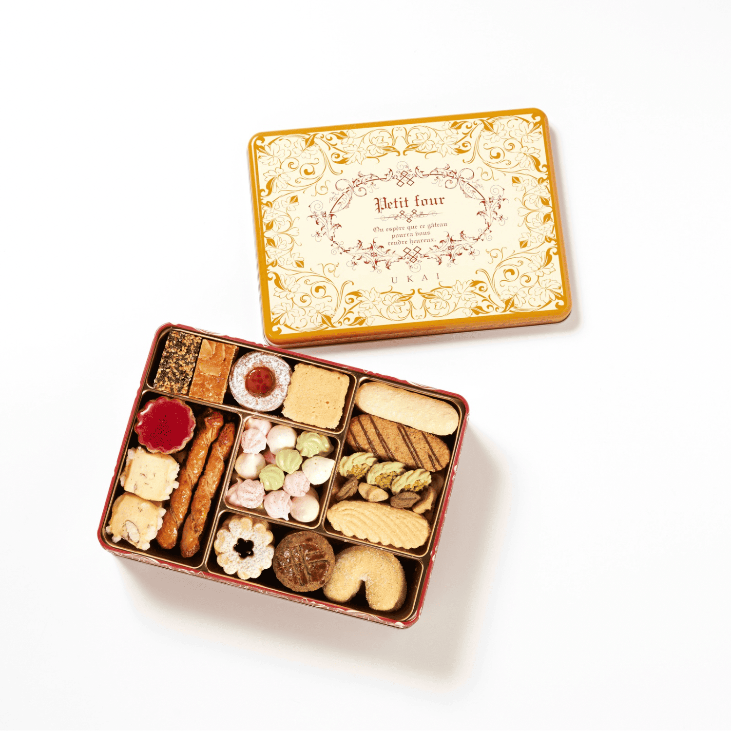 「高級鉄板料理店『うかい亭』の食後に出される小菓子が評判となり誕生した『アトリエうかい』。夫のお客様との会食や出張先など、大人数で楽しんでいただく場面で選ぶのがこちらの大缶です。まず目を引くのは、色とりどりのクッキーが宝石箱のように詰められた美しさ。缶を開けた瞬間に広がる甘く芳醇な香りも魅力です。16種類ものクッキーが入っており、ホロホロと崩れる繊細な食感から、サクサクのパイ、しっとりとしたジャムサンドまで、最後まで飽きることなく多彩な味わいを堪能できます。年配の方から若い方まで幅広く喜んでいただける名品です」(後藤さん)