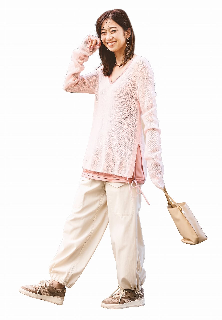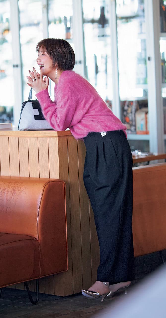 パンツ¥29,700(ル フィル)ニット¥49,500(ザ シンゾーン/シンゾーン ルミネ有楽町店)バッグ¥121,000〈ルッツ モリス〉靴¥59,400〈ペリーコ〉(ともにアマン)ピアス¥66,000(カラットアー/イセタンサローネ東京)ネックレス¥33,000(マリハ)リング¥24,200(ココシュニック オンキッチュ/ココシュニック)