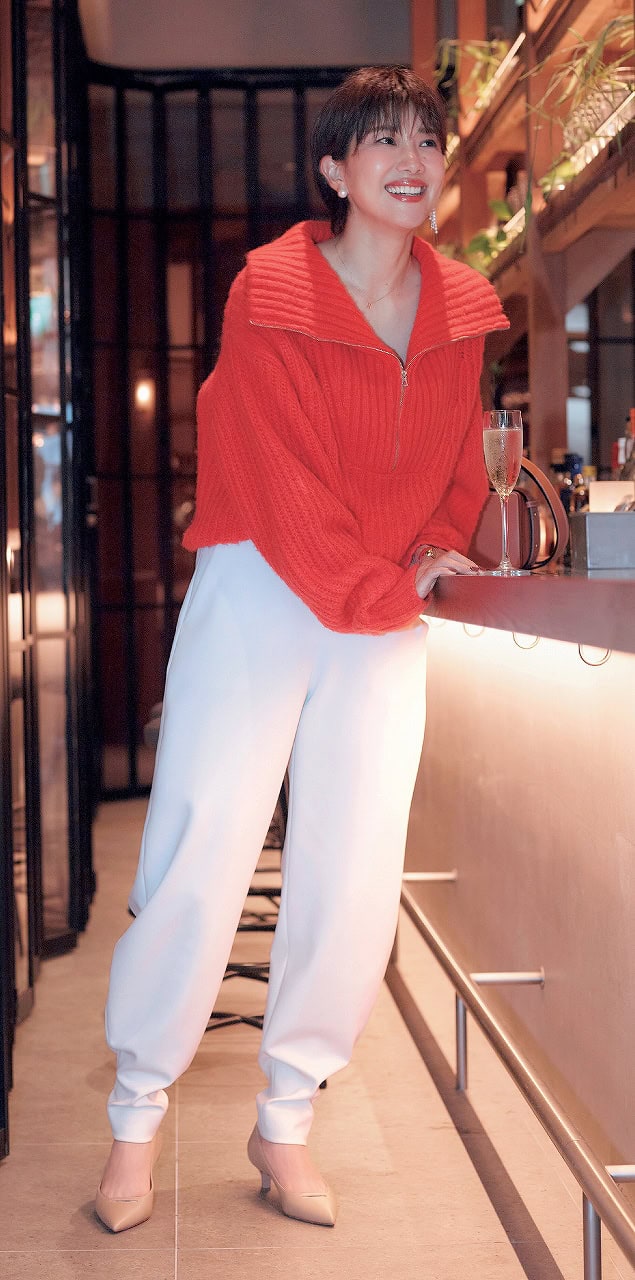 エネルギッシュなオレンジは白パンツでクリーンに。カラーのハッピー感をキープしながら大人顔に整います。上品な小物で艶感をプラスすればディナーシーンにも◎。新年にぴったりな多幸感コーデです。