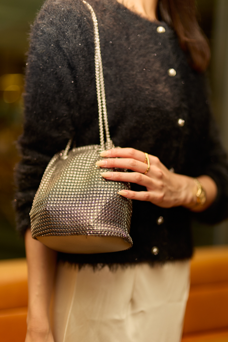 「ラメカーディガンは、きちんと感がありつつ1枚で華やぐので、仕事帰りの平日忘年会にぴったりです。パーティファッションでは、写真映えするように顔まわりが華やかなトップスにして、両手が空くチェーンバッグなどでグラスやお皿を持てるように気をつけています」