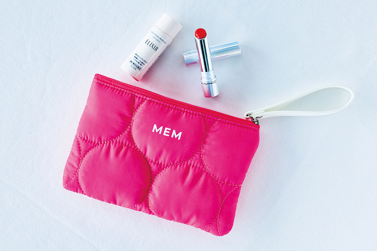 話に夢中になりメーク直しに行くのを忘れがちな女子会では、色もちのいいディオールリップが欠かせない存在。ツヤも大切だからディオールのハイライト004やSUQQUのチーク07、SUQQUのアイシャドウ14を頰や額、瞼に重ねてキラッとした輝きをプラス。必要最低限だけボナベンチュラのポーチに入れています。