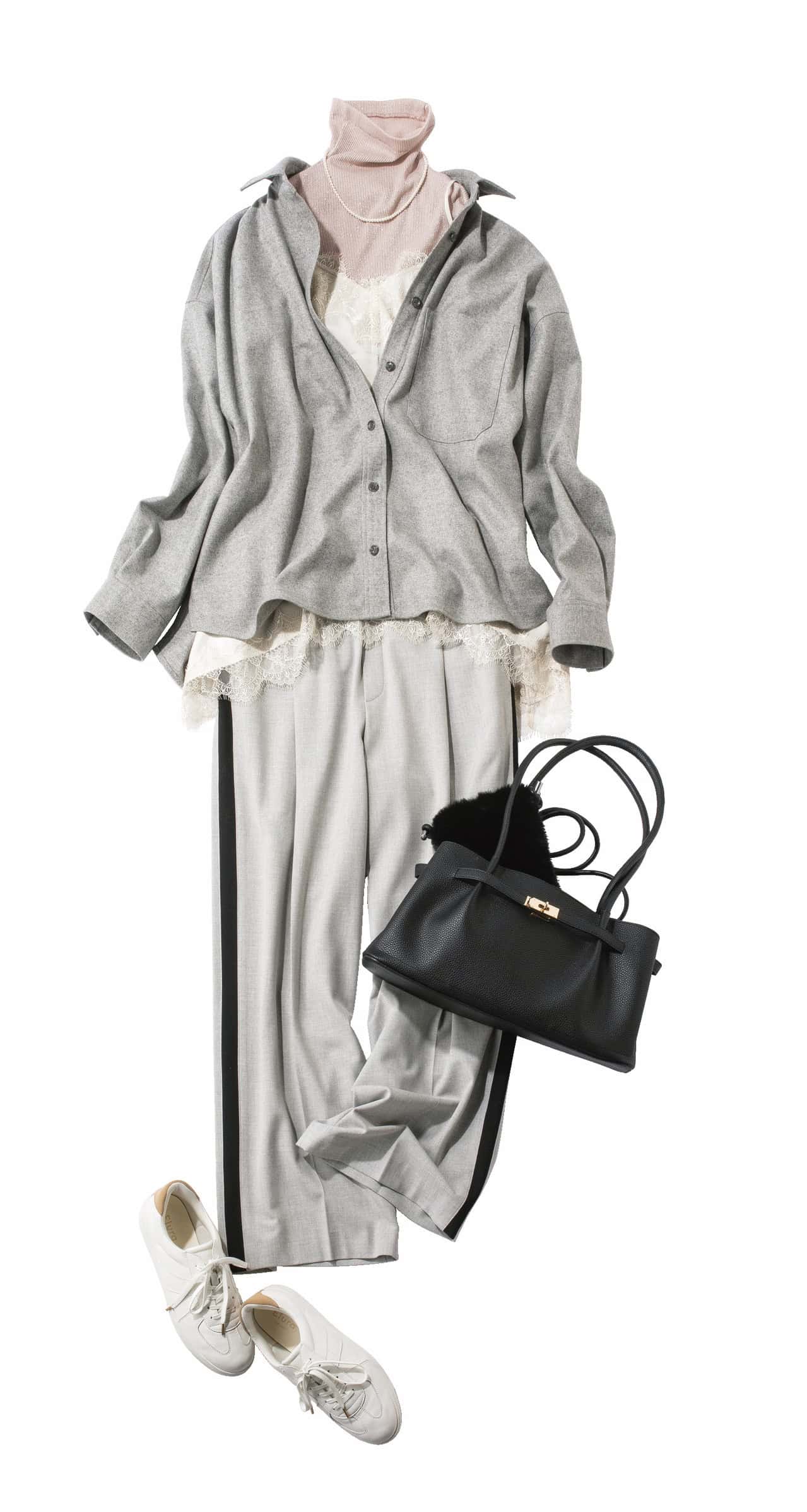 ウールライクシャツ¥7,700 ラメタートル¥4,400 レースサテンキャミソール¥6,600 ラインワイドパンツ¥8,250 スニーカー¥9,350 バッグ¥8,250  ファーバッグ¥4,620 パール付きシュシュ¥2,750 (すべてエルーラ/アダストリア)パールネックレス、ピアス(ともに参考商品)