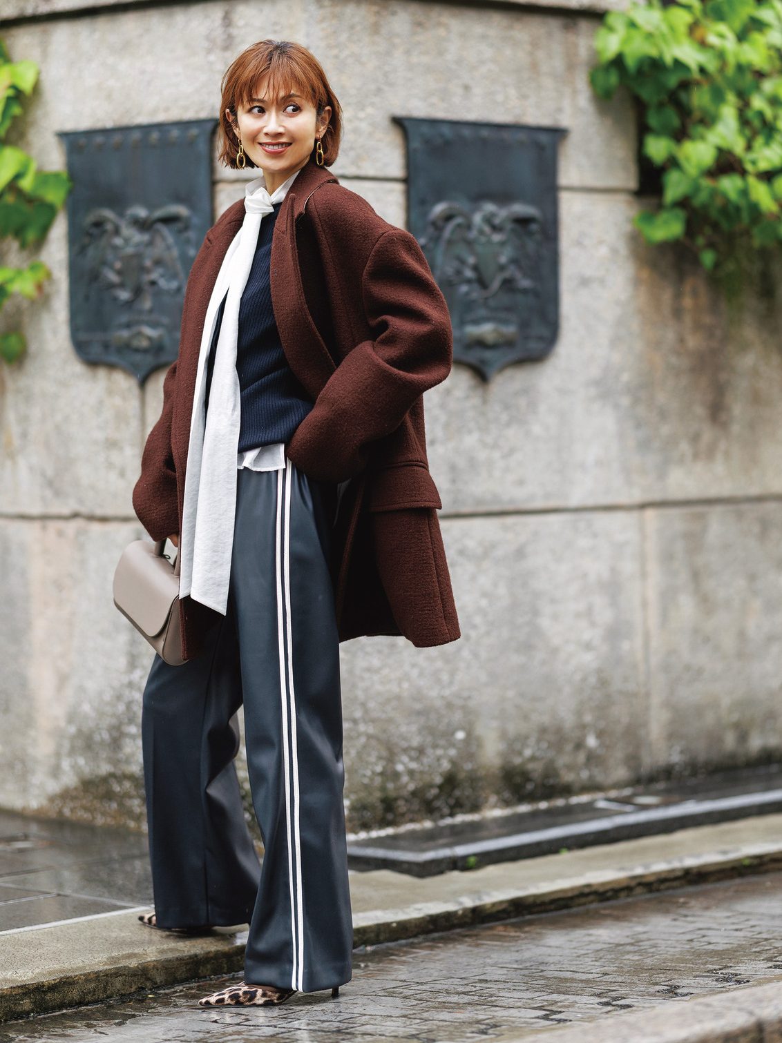 パンツ¥49,500(サードマガジン)コート¥154,000(エストネーション)ニット¥25,300(HER.)中に着たボウタイブラウス¥39,600(エブール/リトルリーグ)バッグ¥85,800(サルチェ/フラッパーズ)パンプス¥33,000(ハァウ/ウィム ガゼット 玉川髙島屋S・C店)ピアス¥8,800(ワンエーアールバイウノアエレ/ウノアエレ ジャパン)