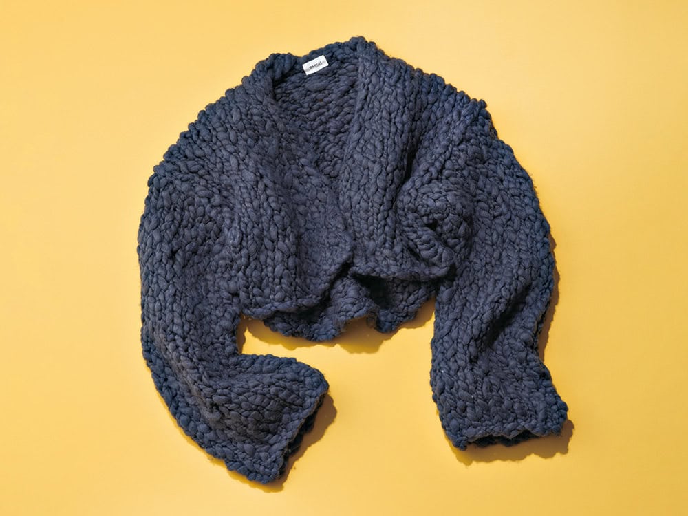 手編み風で、前が短く、後ろは長めのボレロタイプ。太くて長い袖がお茶目です。カーディガン(ハクジ/ショールーム リンクス)