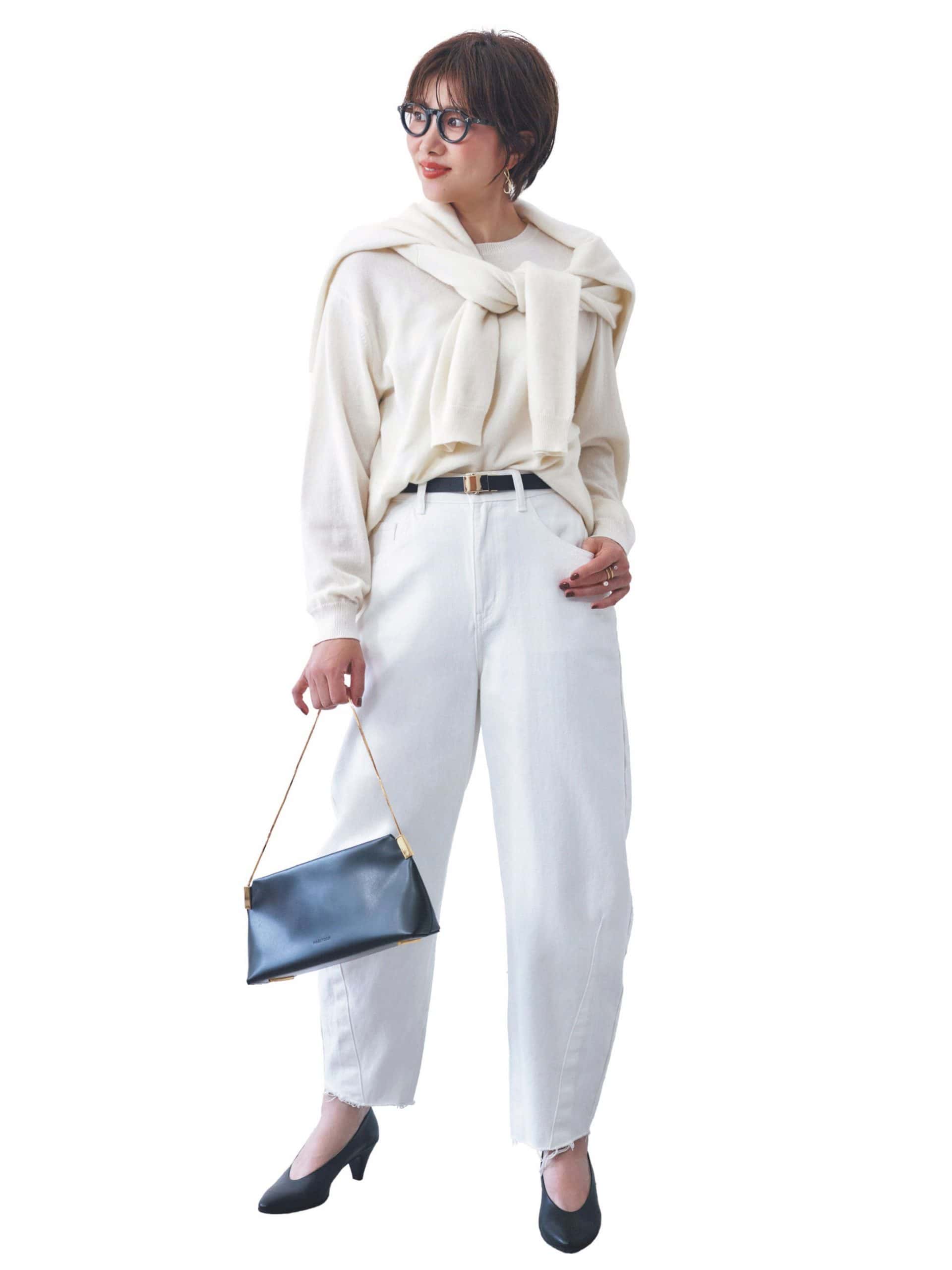 ともすれば「張り切ってます」感が出てしまうオールホワイトのコーデも、デニム軸ならちょうどいい華やぎカジュアルに!膨張色でもシャープなシルエットなので、不思議とスタイリッシュに着こなしに。